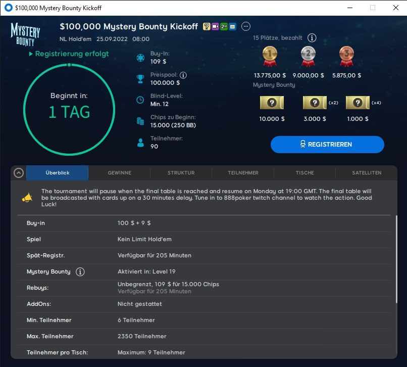 Los geht es morgen, am Sonntag, um 20:00 Uhr. Es werden 12 Min Blind-Level gespielt. Das Finale findet am Montag statt und wird live auf dem Twitch von 888poker übertragen.