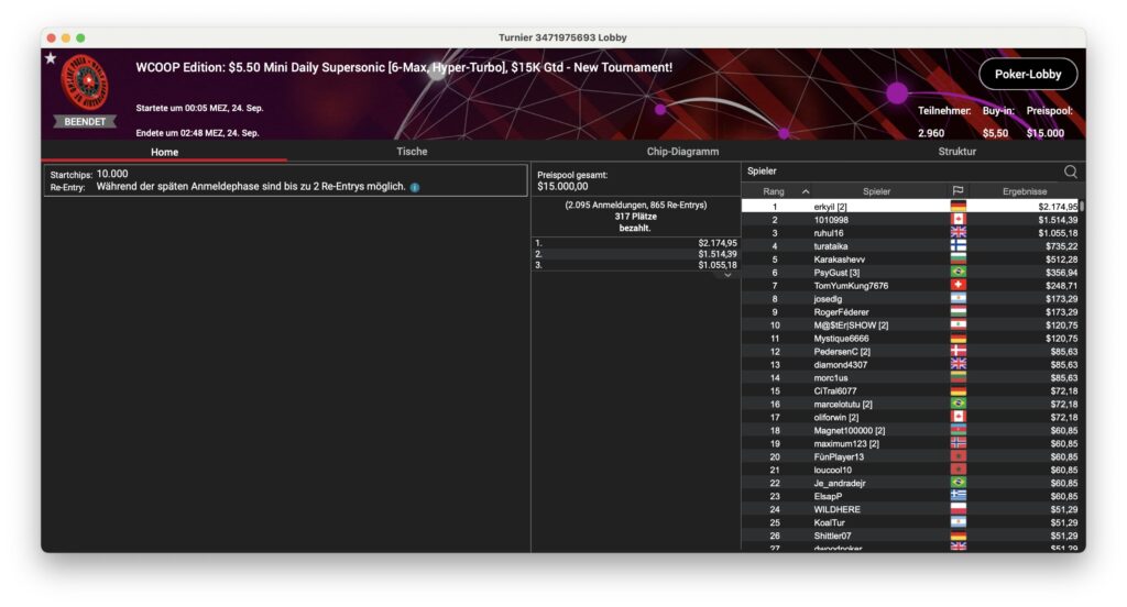 „erkyil“ gewann das $5,50 Mini Daily Supersonic mit 2.960 Runnern und $15.000 Preispool. $2.174 gab es für den Sieg.