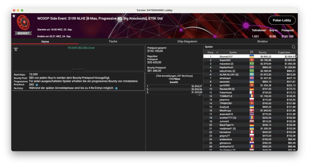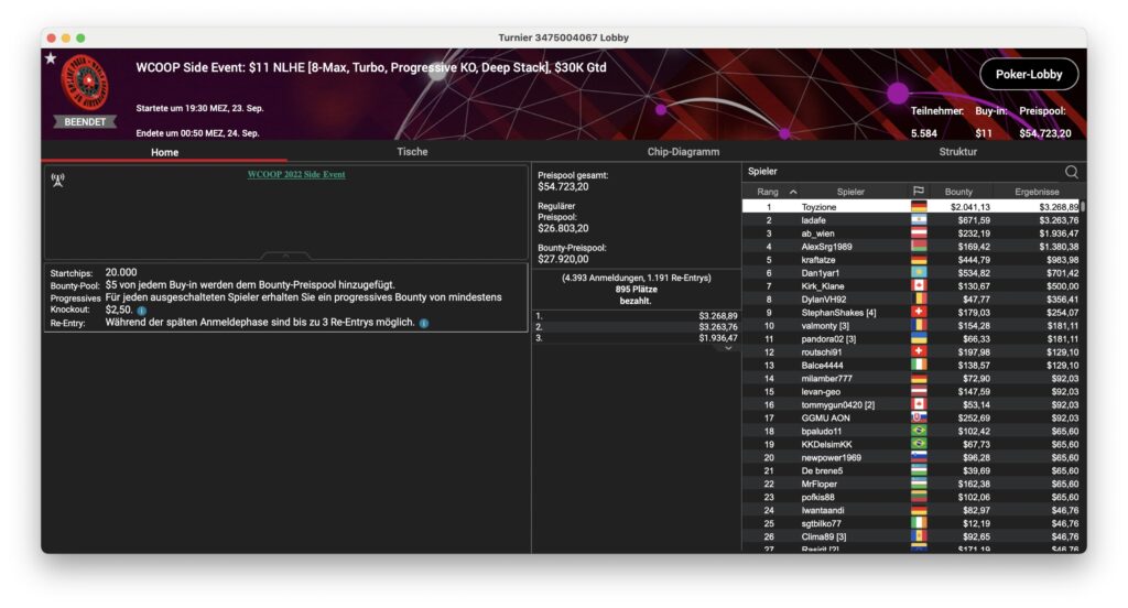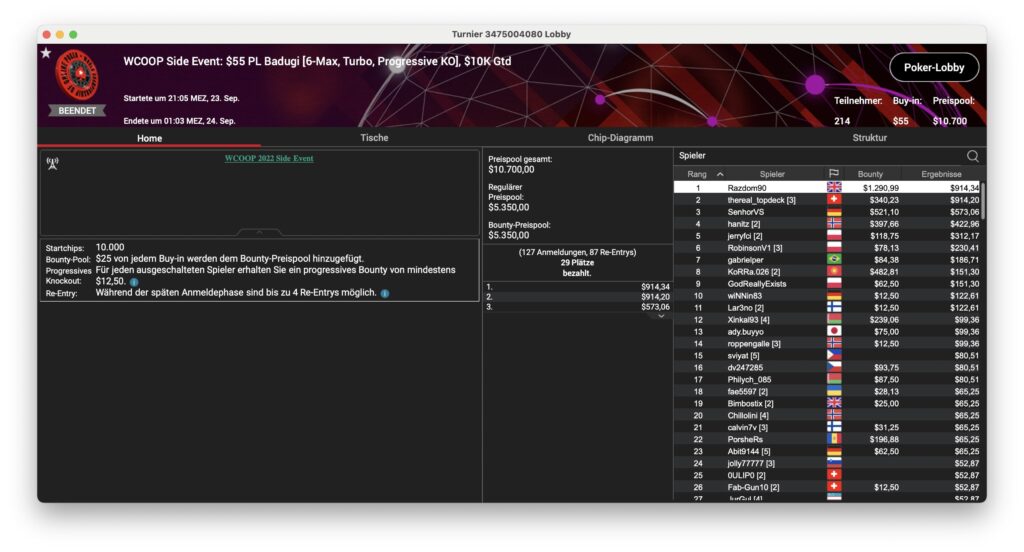 Beim $11 Mini Cooldown ging der Sieg an „putzo_944“ aus Österreich für $1.692 + $2.501. Runner-Up wurde der deutsche Spieler „‚oOBEASTOo'“ für $526 + $2.498.