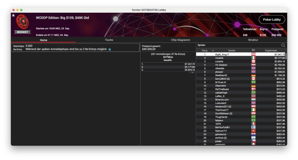 Das Big $109 hatte $40.000 Garantie-Preispool bei 348 Startern, $7.047 gab es für den Sieg von „BigM_King17“. Das $11 NLHE Side Event ging an den deutschen Spieler „Toyzione“ für $2.041 + $3.268.