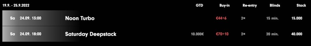 Gleich zwei Turniere finden im Grand Casino Aš am Samstag statt, das Noon Turbo und das Saturday Deepstack. Um 13:00 Uhr startet das €44+6 Noon Turbo mit 15 Min Blindleveln, und zwei möglichen Re-Entries.