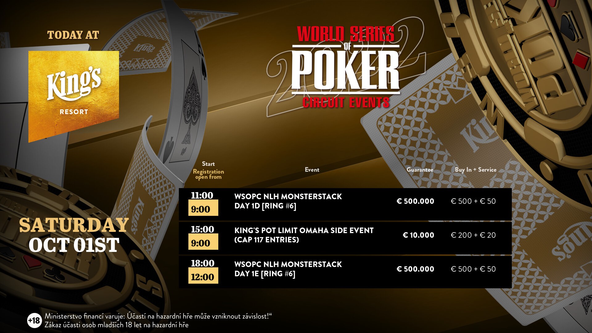 Weiter geht es heute beim WSOPC Monsterstack um 11 Uhr mit Flight 1D und um 18 Uhr mit Flight 1E. Außerdem wird um 15 Uhr noch das €200+20 King’s Pot Limit Omaha Side Event gespielt.
