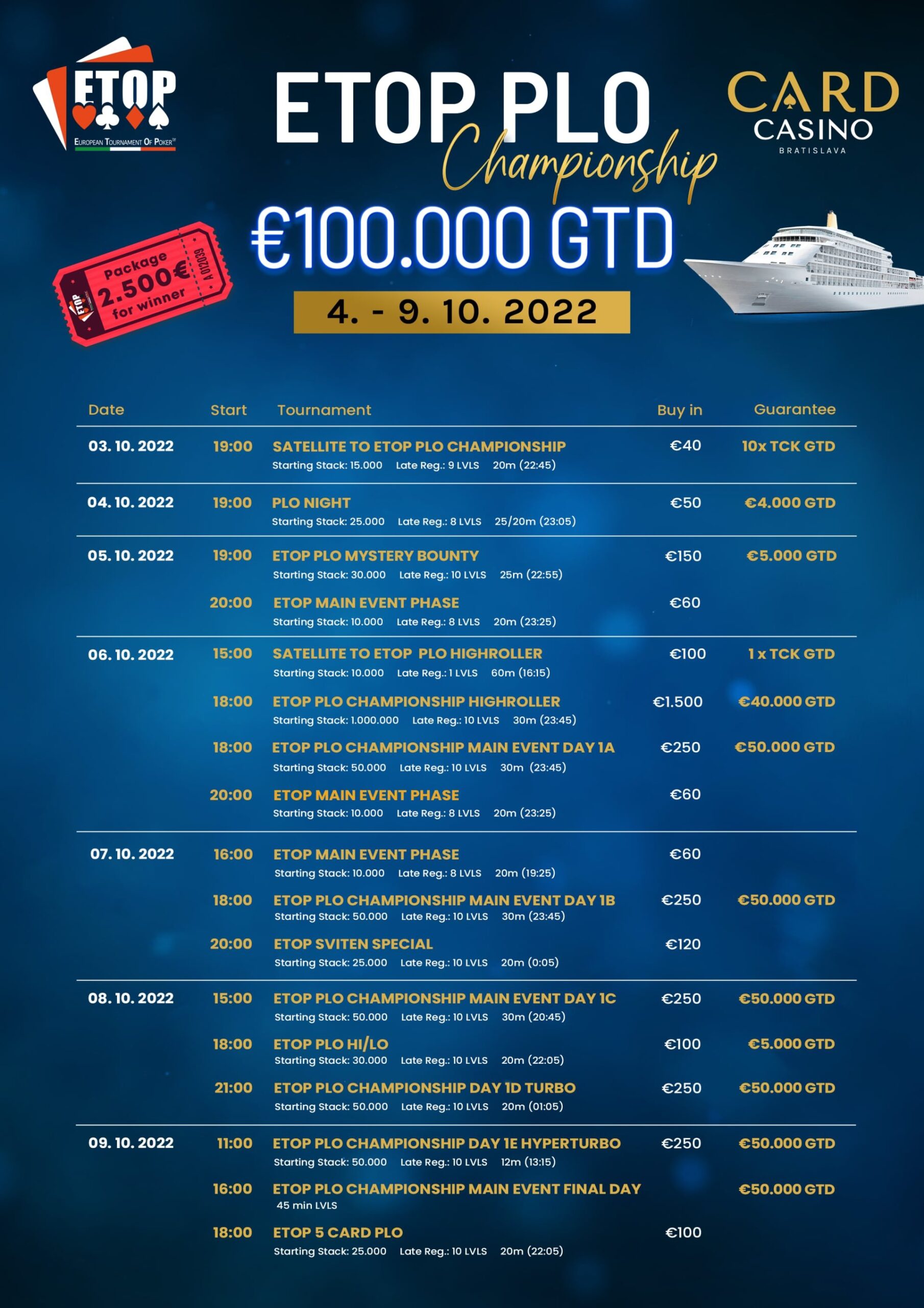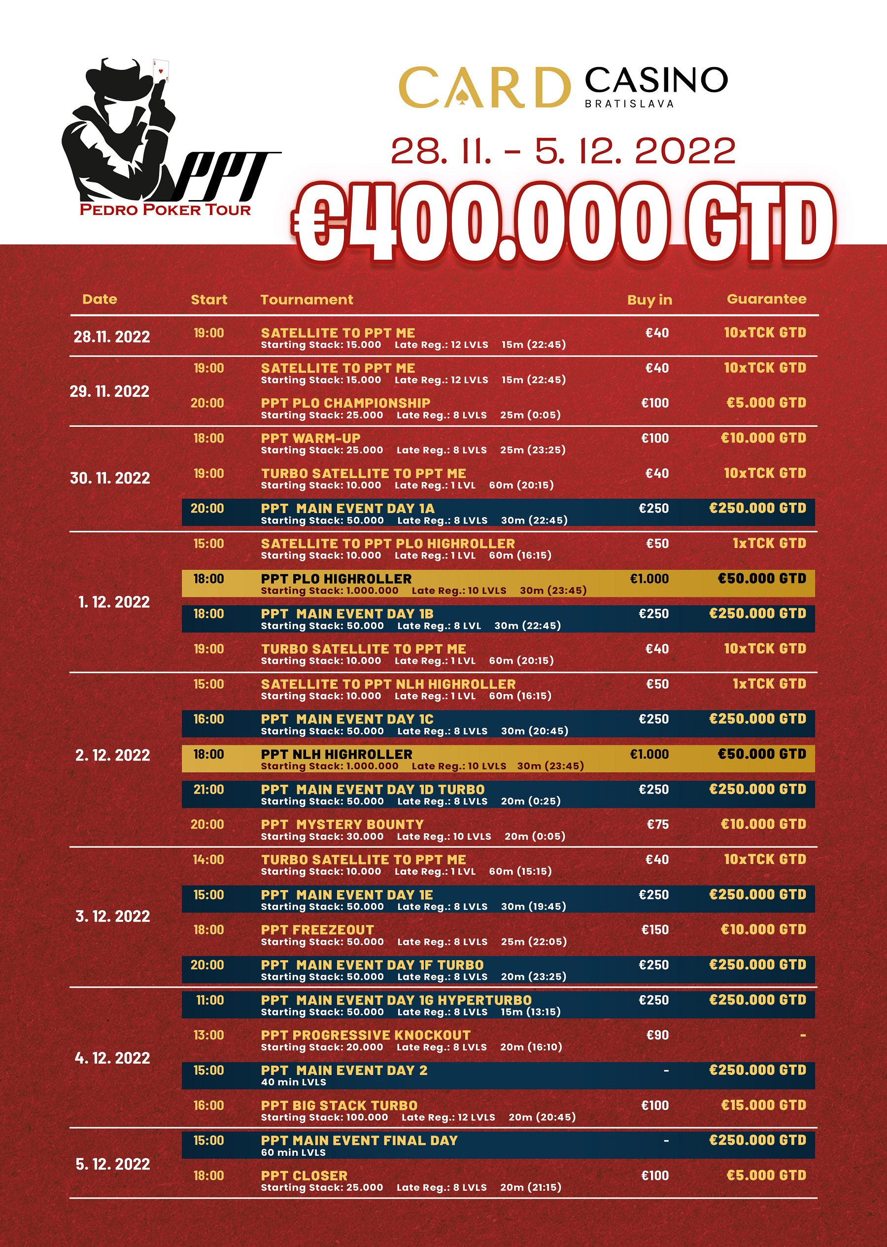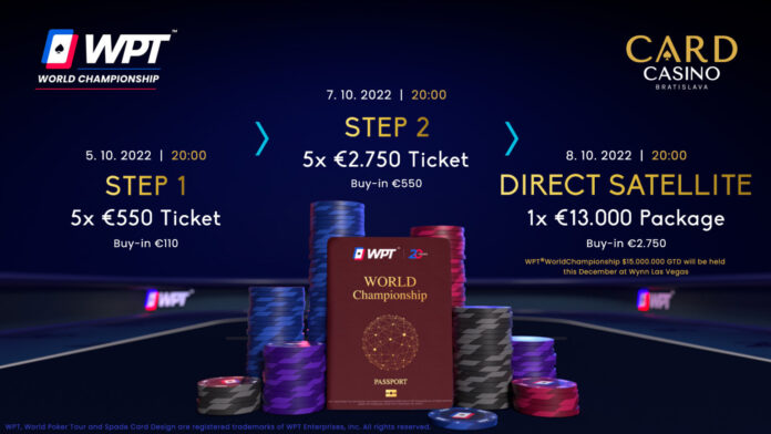 Wer sich dieses Ausnahme-Event nicht entgehen lassen möchte, hat ab Mittwoch den 05. Oktober 2022 im Card Casino Bratislava die Möglichkeit ein $13.000 WPT World Championship Package zu gewinnen.