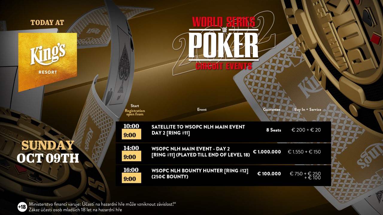 Heute steht das King’s zunächst ganz im Zeichen des WSOPC Main Event. Nach dem letzten Mega Satellite um 10 Uhr steht um 14 Uhr Tag 2 an.