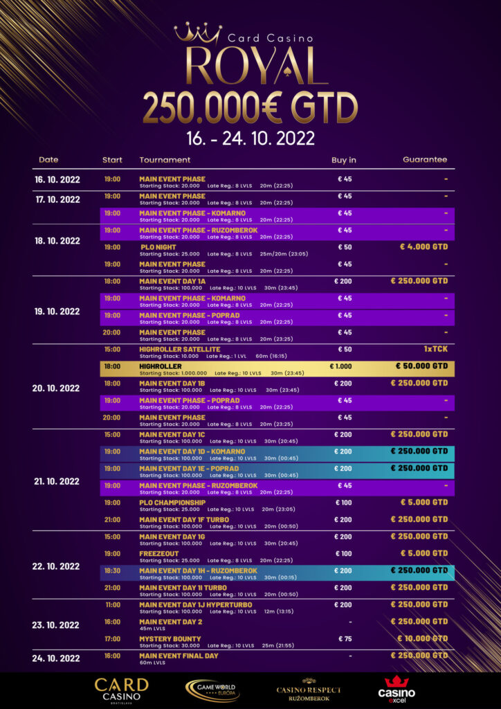 Dabei finden verschiedene Startflights auch außerhalb des Card Casinos Bratislava statt. Dabei sind Flights im Game World Európa Komár, Casino Excel Poprad und im Respect Casino Ruzomberok geplant – alle Locations und Zeiten in der Schedule unten.