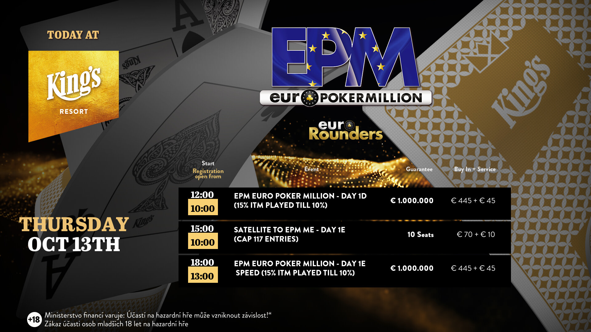 Im King’s Resort Rozvadov wurde am Mittwochabend der dritte von insgesamt neun Starttagen Eins des €445+€45 Euro Poker Million (EPM) Main Events powered by EuroRounders.com gespielt.