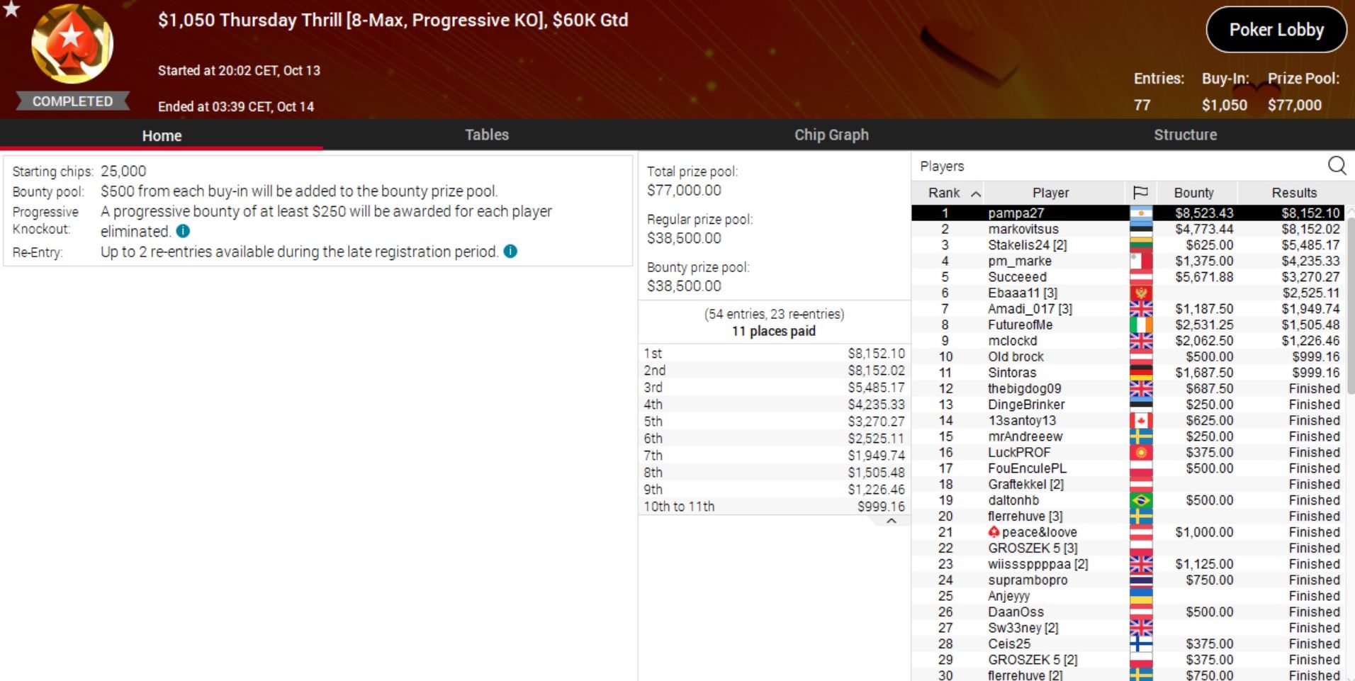 Jakob „Succeeed“ Miegel erreichte dabei gleich zwei Top-Platzierungen. Erst belegte er Platz 5 beim $1.050 Thursday Thrill, was ihm mit Bountys fast $9.000 einbrachte, und dann holte er auch noch rund $2.500 durch Platz 3 beim $530 Cooldown.