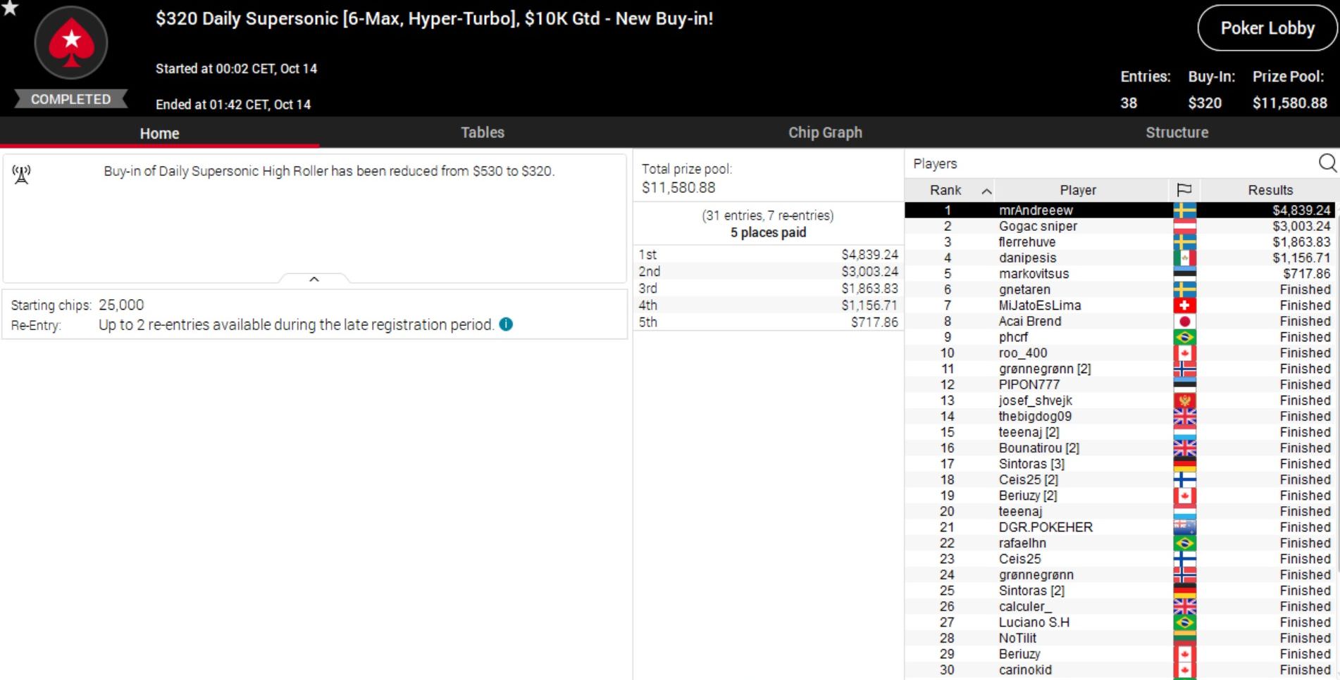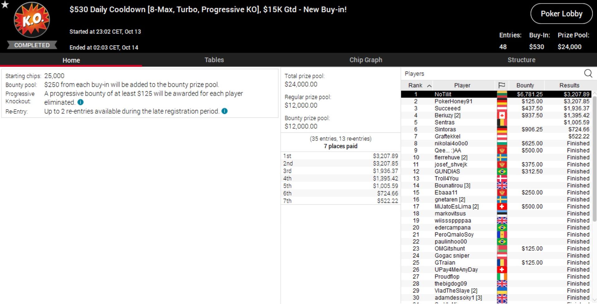 Direkt vor ihm landete sein deutscher Landsmann „PokerHoney91“, der rund $3.300 mitnahm.