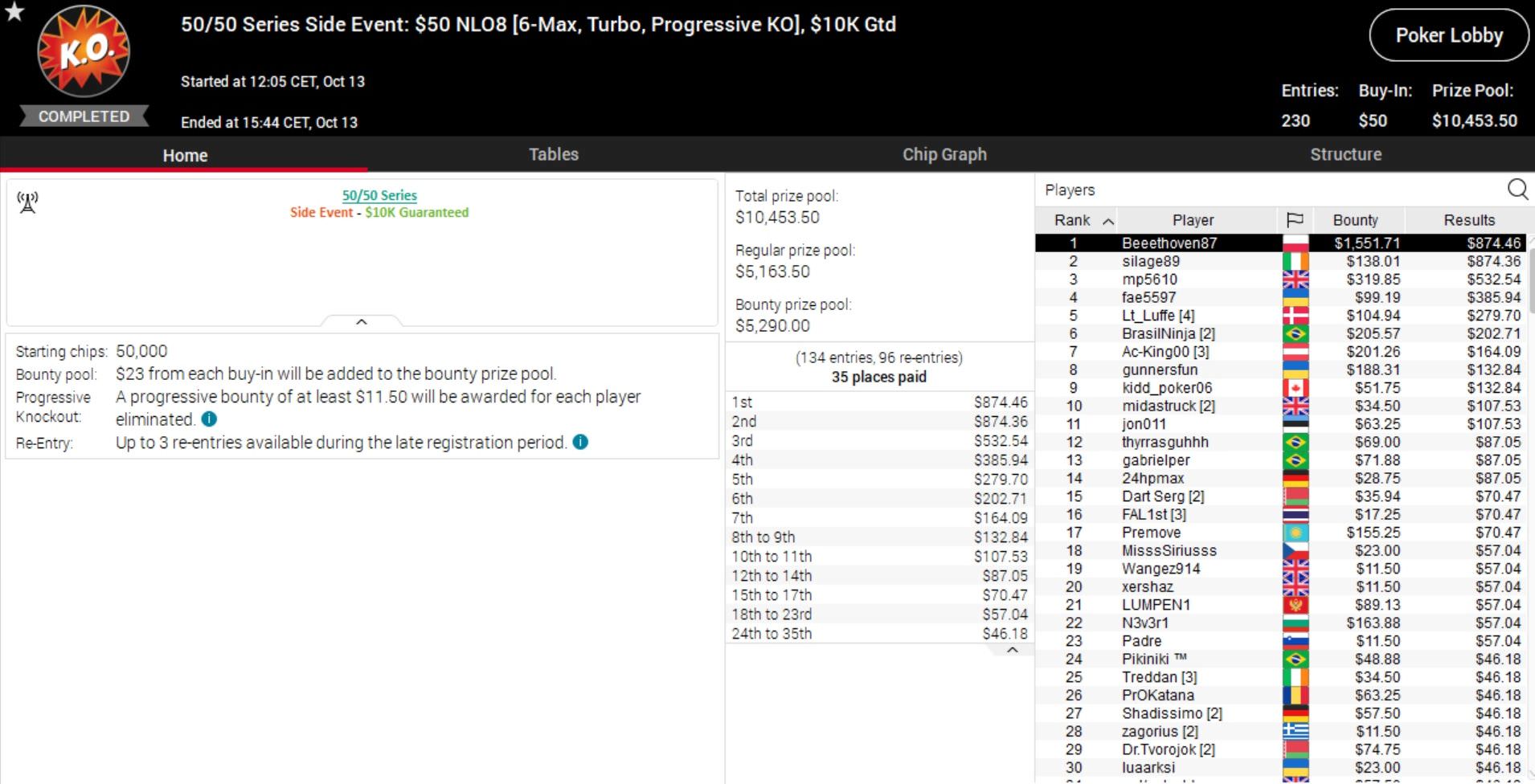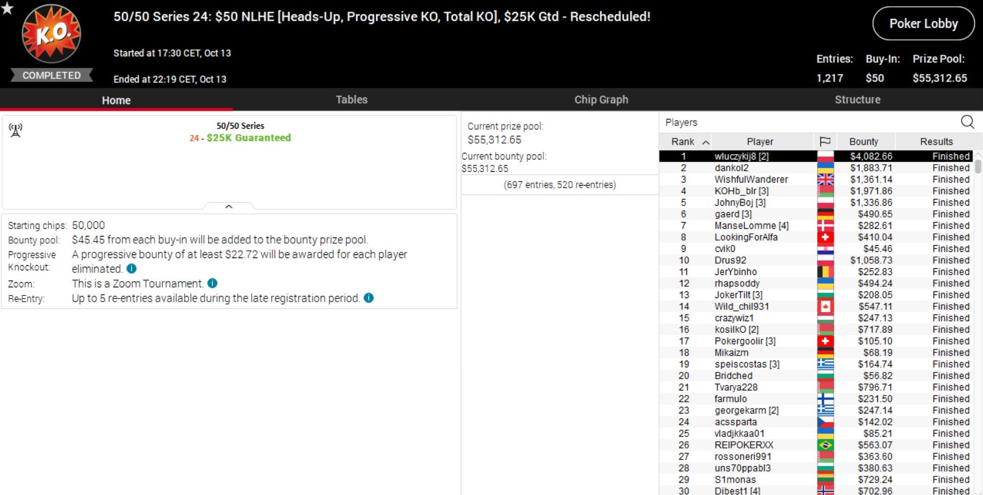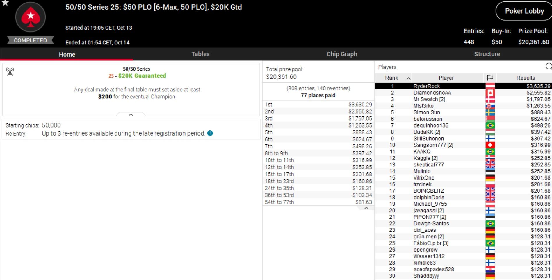 Für den einzigen DACH-Sieg des Tages sorgte „RyderRock“ bei der 50/50 Series. Er sicherte sich das PLO-Event 25 und kassierte über $3.600.