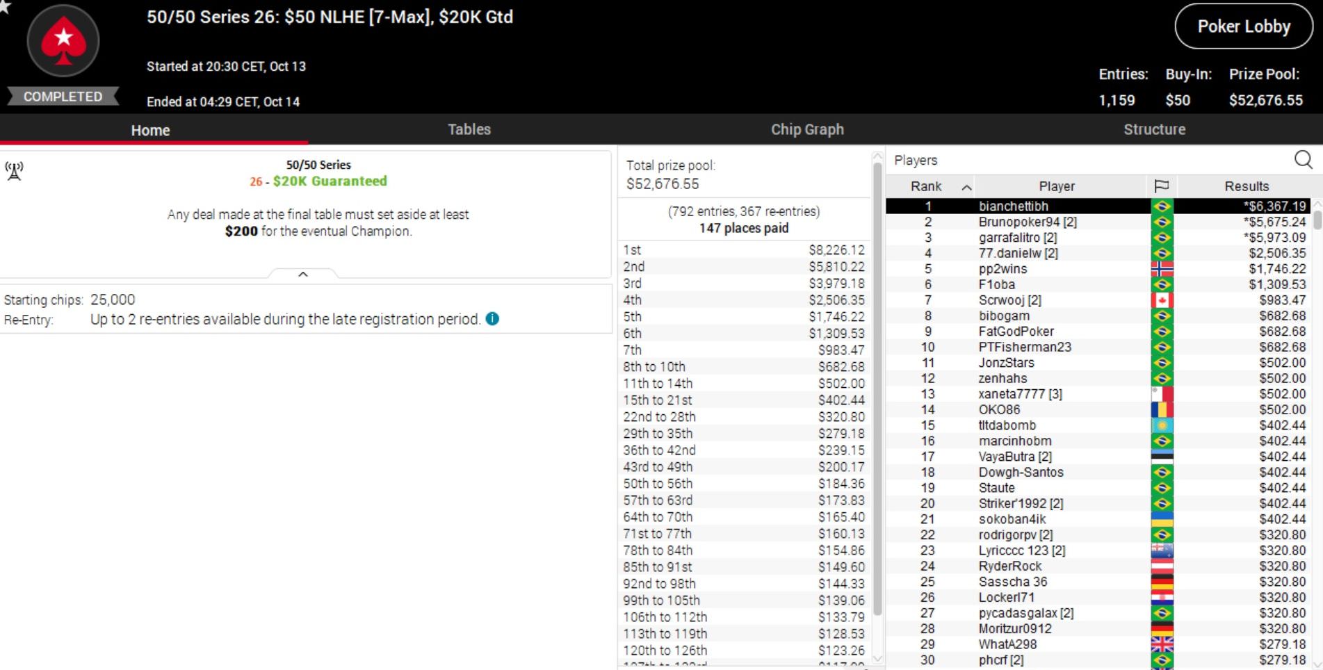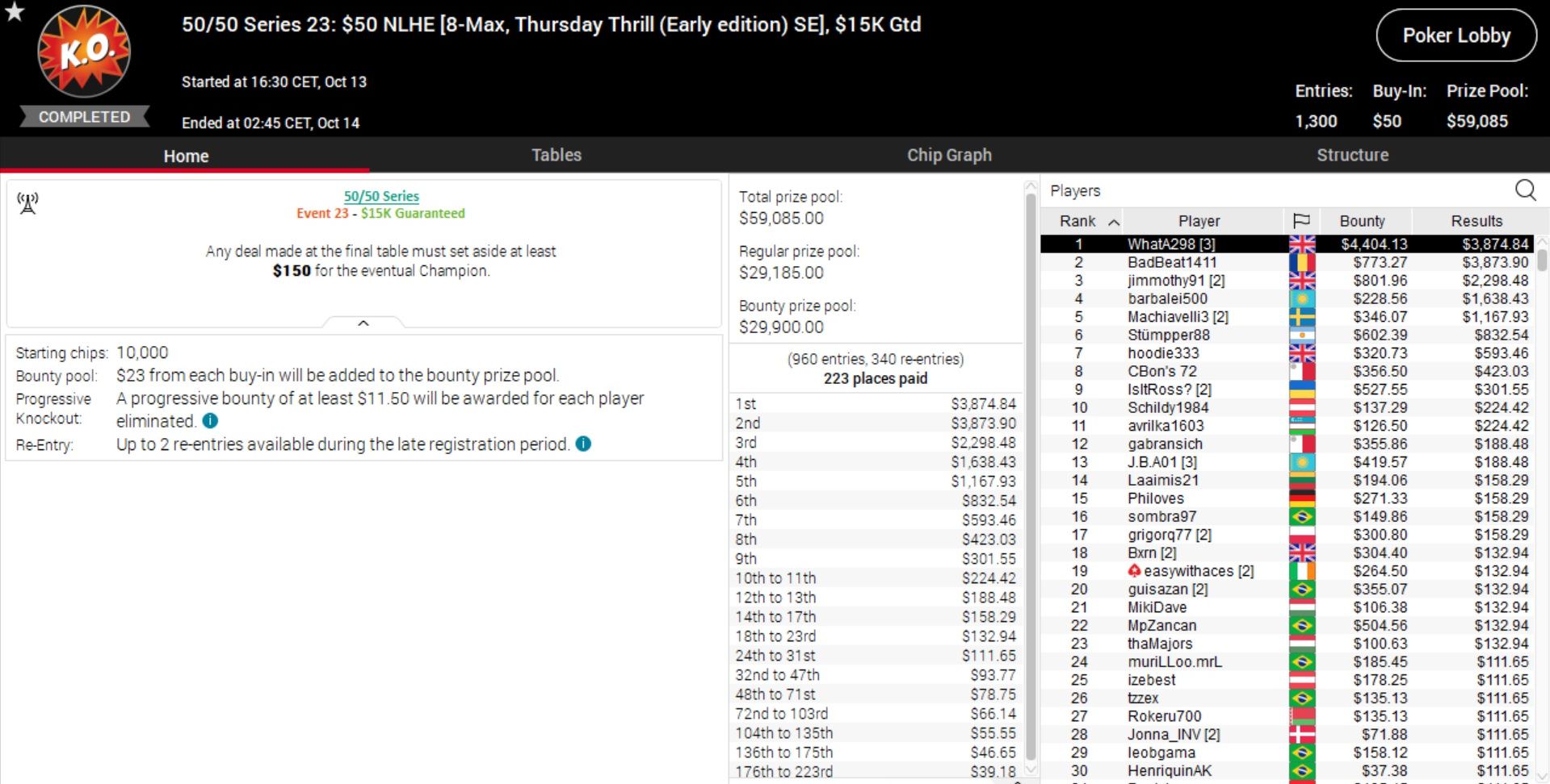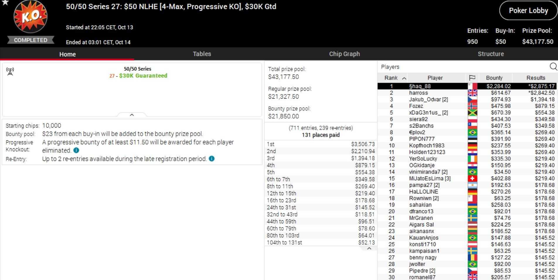 Für den einzigen DACH-Sieg des Tages sorgte „RyderRock“ bei der 50/50 Series. Er sicherte sich das PLO-Event 25 und kassierte über $3.600.