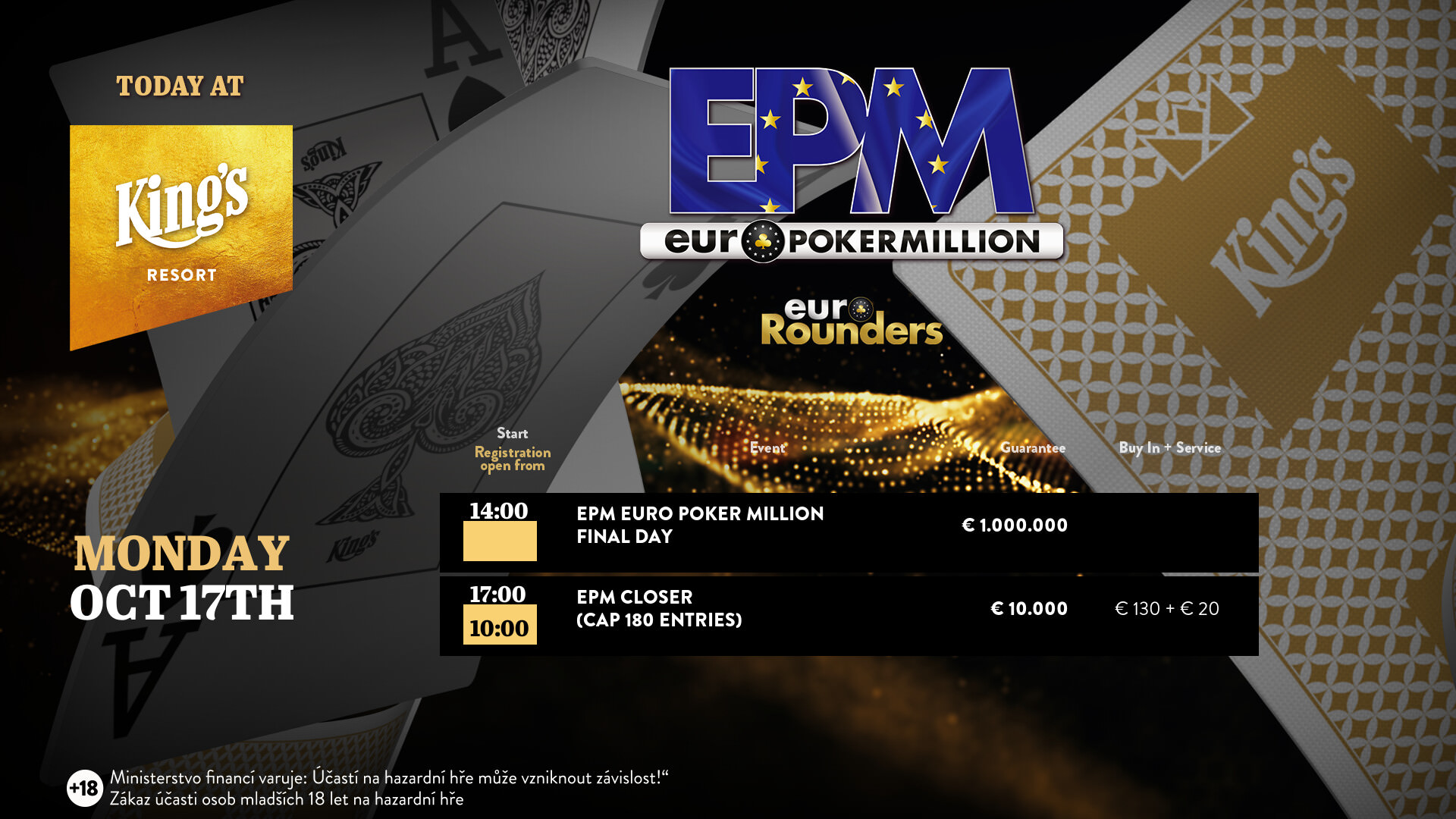 Neben Tag 2 des Euro Poker Million (EPM) Main Event powered by EuroRounders.com wurde im King’s Resort Rozvadov gestern auch noch das EPM High Roller ausgetragen.