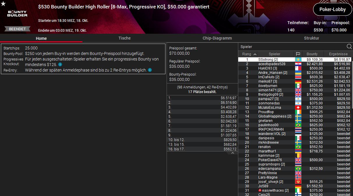 Beim $530 Bounty Builder High Roller ging es bei 140 Entries um $70.000, und hier schaffte meiko87 den Sprung an den Final Table. Letztlich musste sich der Deutsche mit Platz sechs für $2.042 Preisgeld plus $2.531 an Bounties begnügen. Den Sieg für $6.516 plus 9.109 feierte der Kasache SSstrong.
