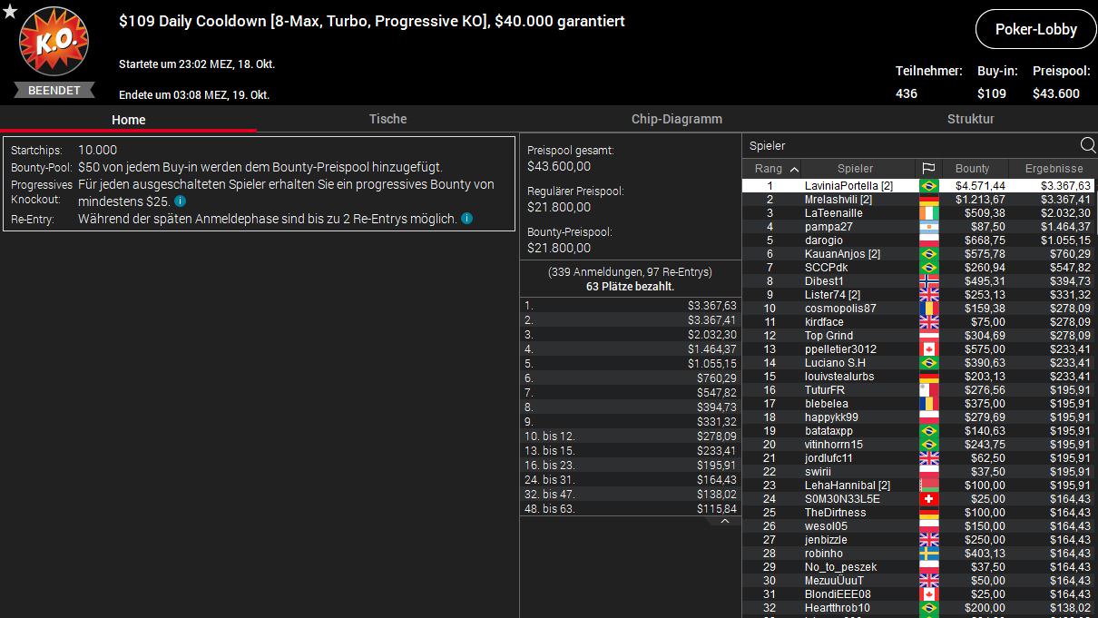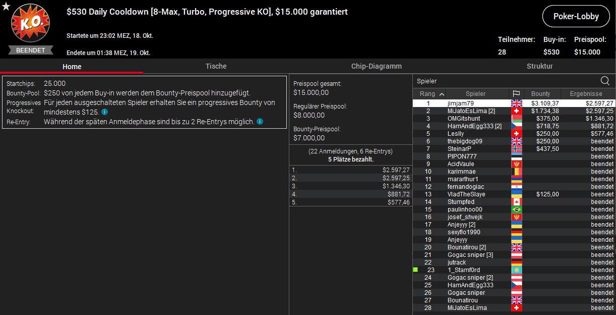 Die besten Platzierungen gelangen MiJatoEsLima aus der Schweiz und Mrelashvili aus Deutschland. MiJatoEsLima kassierte als Runner-up beim $530 Daily Cooldown $2.597 plus $1.734, Mrelashvili für die gleiche Platzierung beim $109 Daily Cooldown $3.367 plus $1.213.