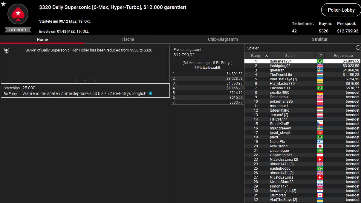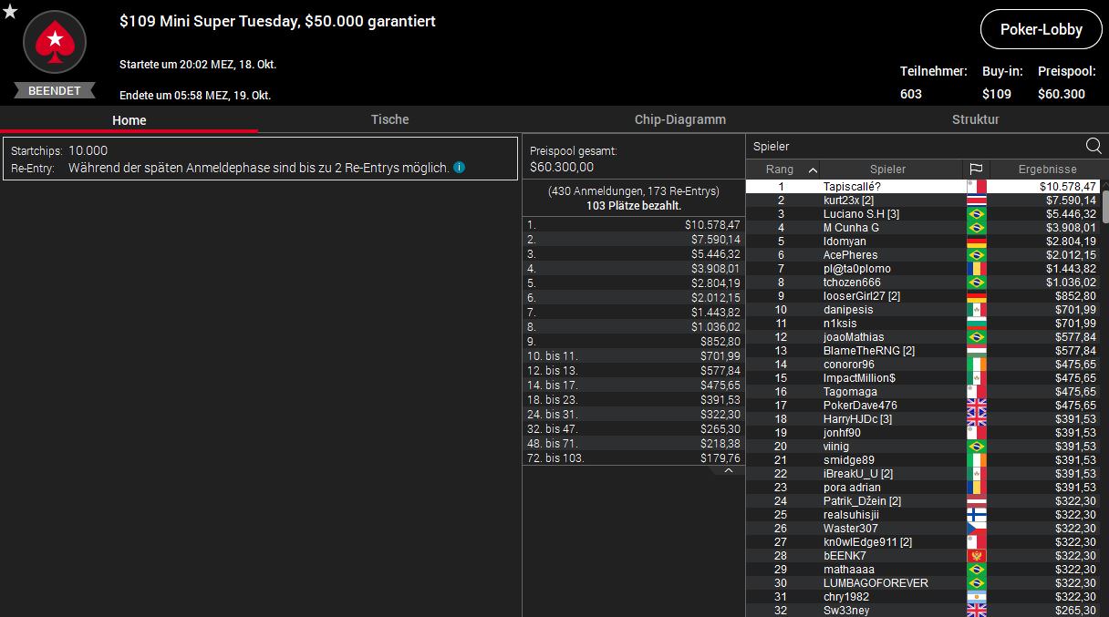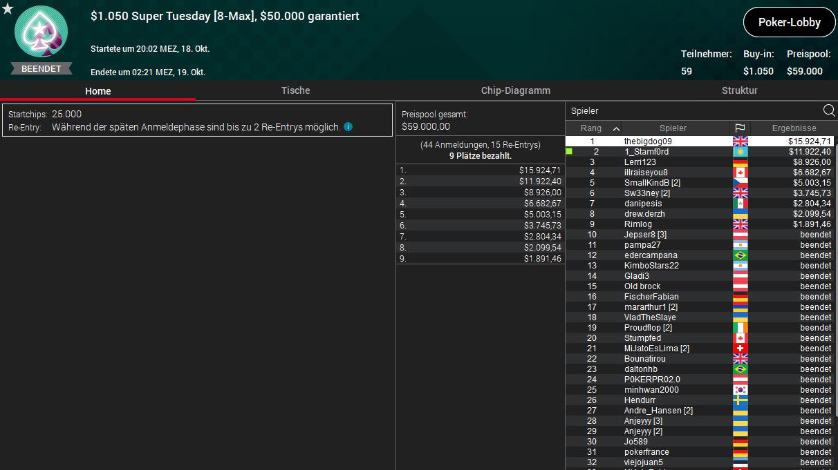 Das höchste Preisgeld räumte Lerri123 aus Deutschland beim $1.050 Super Tuesday ab. Insgesamt wurden bei 59 Entries $59.000 ausgespielt, davon bekam Lerri123 als Dritter $8.926 ab. Den Sieg holte der Brite thebigdog09 für $15.924.