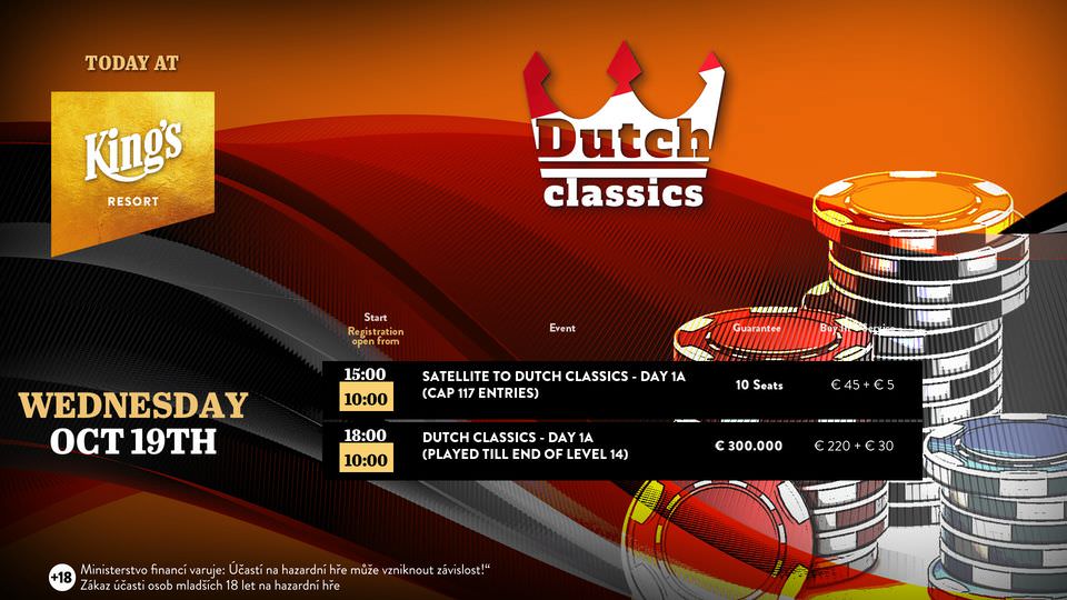 Heute startet im King’s wie bereits angesprochen das Dutch Classic Festival. Um 18 Uhr beginnt Tag 1A beim €220+30 Main Event, für den die Verantwortlichen einen Preispool in Höhe von €300.000 garantieren. Insgesamt werden in den kommenden Tagen sechs Starttage gespielt.