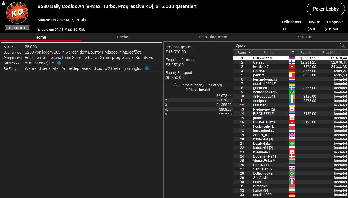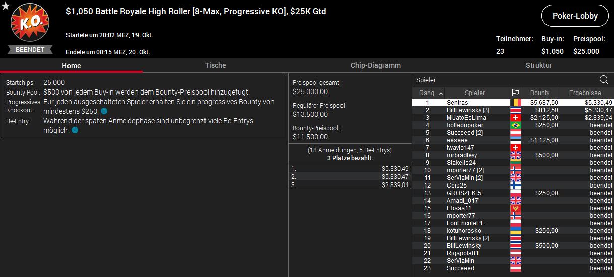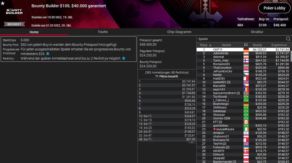 Ähnlich stark war die Performance beim $109 Bounty Builder. Hier gab es 484 Entries und OKP11 aus Deutschland feierte den Sieg für $3.741 Prämie plus $4.122 an Bouties. Der Österreicher ddonkat kassierte als Dritter $2.356 plus $911.