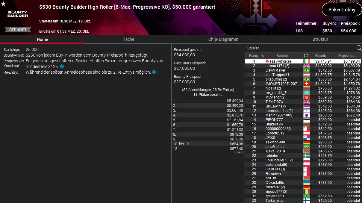 Im High-Roller-Segment lieferte PokerStars Ambassador und Twitch-Streamer Fintan easywithaces Hand durch den Sieg beim $530 Bounty Builder High Roller die Schlagzeile. Bei 108 Entries wurden insgesamt $54.000 ausgespielt, davon gingen $5.499 plus $9.710 an Hand, der sich Heads-up gegen Simon simon1471 Higgings durchsetzen konnte. JustTrappedU aus Österreich bekam als Vierter $2.815 plus $1.593 ausbezahlt.