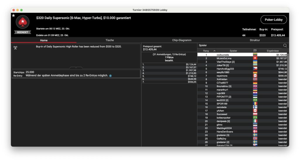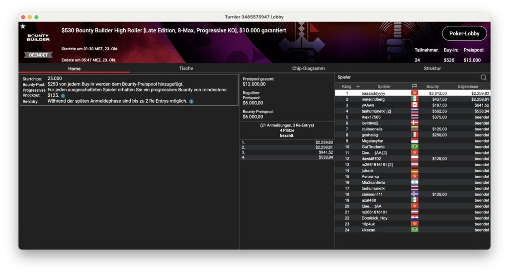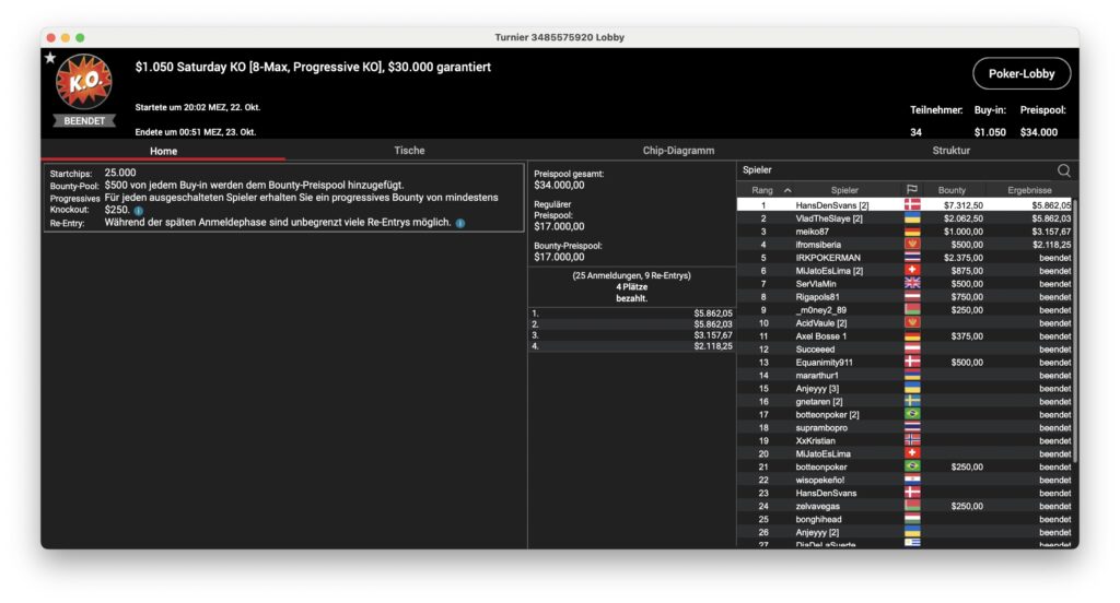 Das $1.050 Saturday KO ging an den Dänen „HansDenSvans“, der sich in einem Feld von 34 Entries an die Spitze spielte und $7.312 + $5.862 auf sein PokerStars-Konto überwiesen bekam. „meiko87“ aus Deutschland wurde Dritter für $1.000 + $3.157.