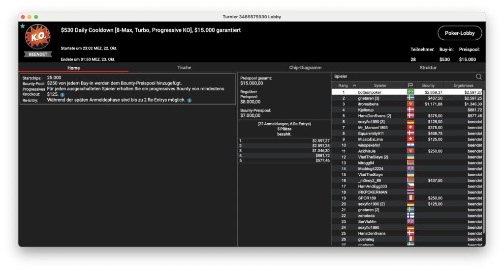 Brunno „botteonpoker“ Botteon schnappte sich das $530 Daily Cooldown. 28 Entries brachten hier einen $15.000 Preispool zusammen – auf den Punkt die Garantiesumme. Botteon durfte sich als Sieger über $2.859 + $2.597 freuen.