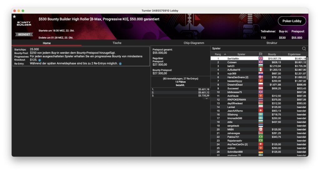 Das Bounty Builder HR hatte 110 Entries und einen $55.000 Preispool. Der Brite „SerVlaMin“ konnte sich im Heads-Up gegen seinen Landsmann „Culzean“ durchsetzen und den Sieg und $10.007 + $5.601 abstauben.