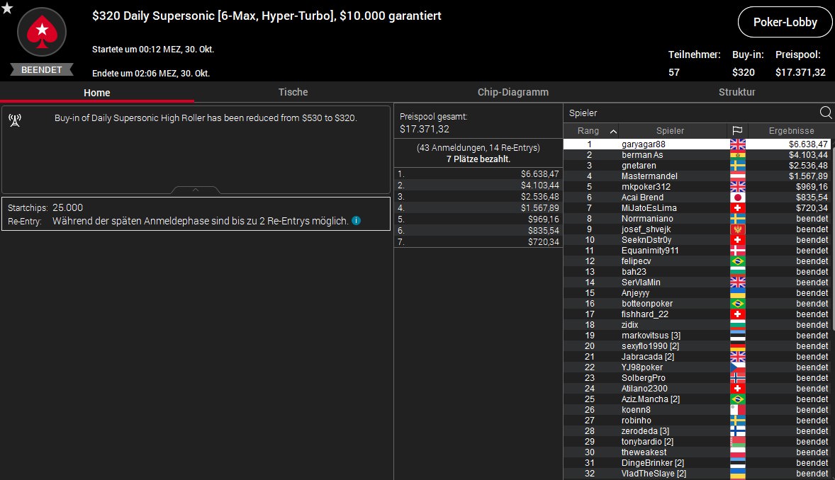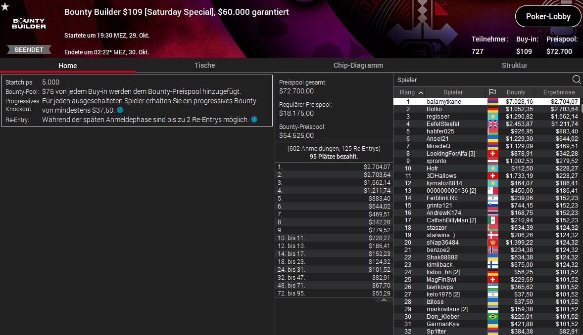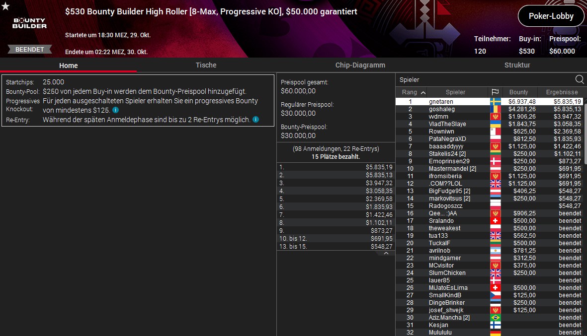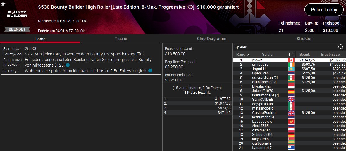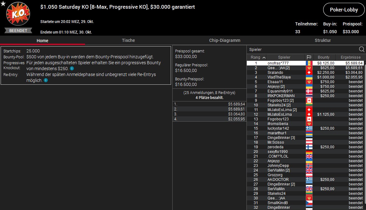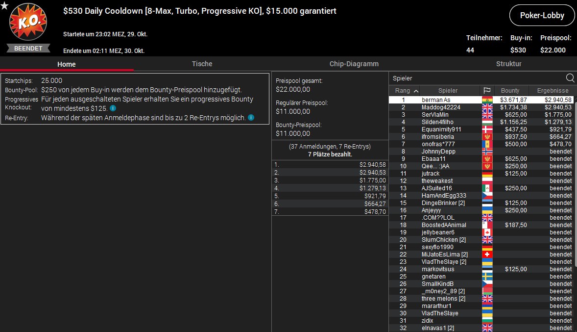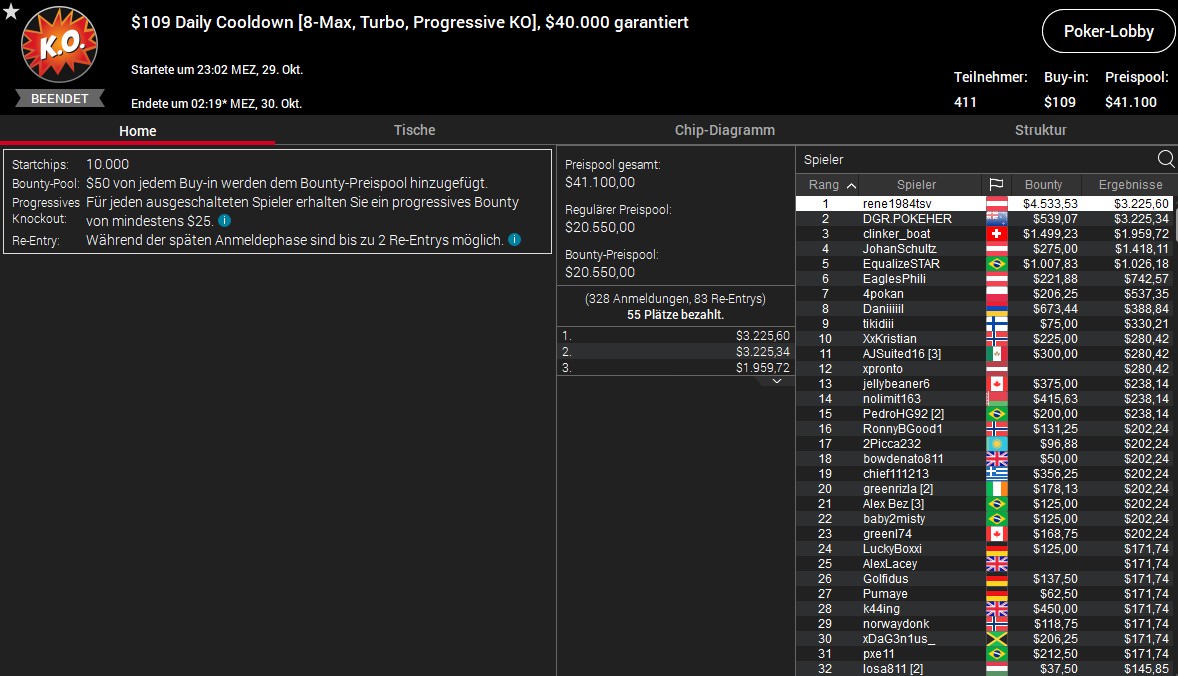 Einen Sieg feierte zudem rene1984tsv aus Österreich. ER gewann das $109 Daily Cooldown für $3.225 plus 4.533 an Bounties. Die Plätze drei und vier gingen an den Schweizer clinker_boat ($1.959/$1.499) und den Österreicher Johan Schultz ($1.418/$275).