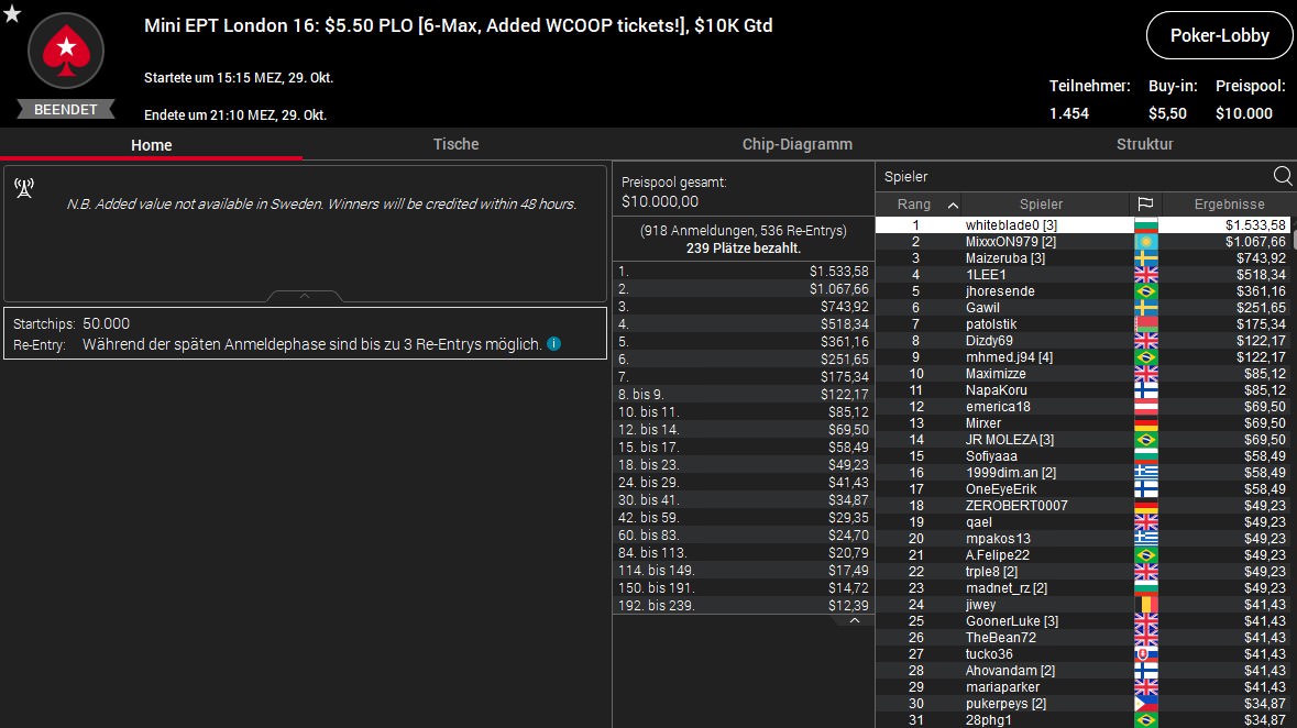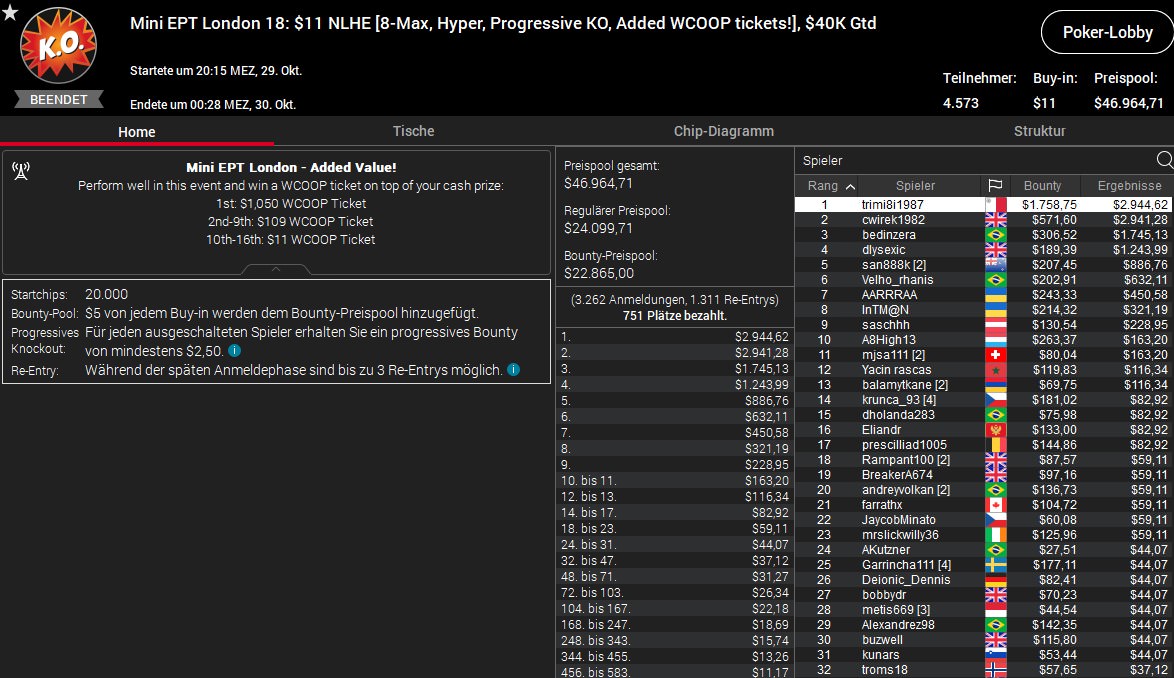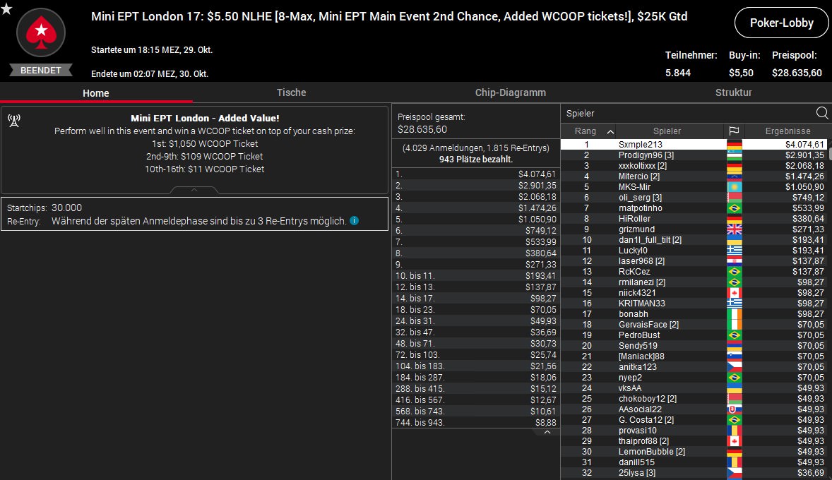 Bei der Mini EPT London hat sich, wie schon beim Main Event, auch beim $5,50 Mini EPT Main Event 2nd Chance ein deutscher Spieler in die Siegerliste eingetragen. Sxmple213 bekam für den Sieg nicht nur $4.074 Prämie ausbezahlt, sondern zusätzlich auch noch ein $1.050 WCOOP-Ticket gutgeschrieben. Landsmann xxxkoltixxx kassierte als Dritter $2.068 plus ein $109 WCOOP-Ticket.