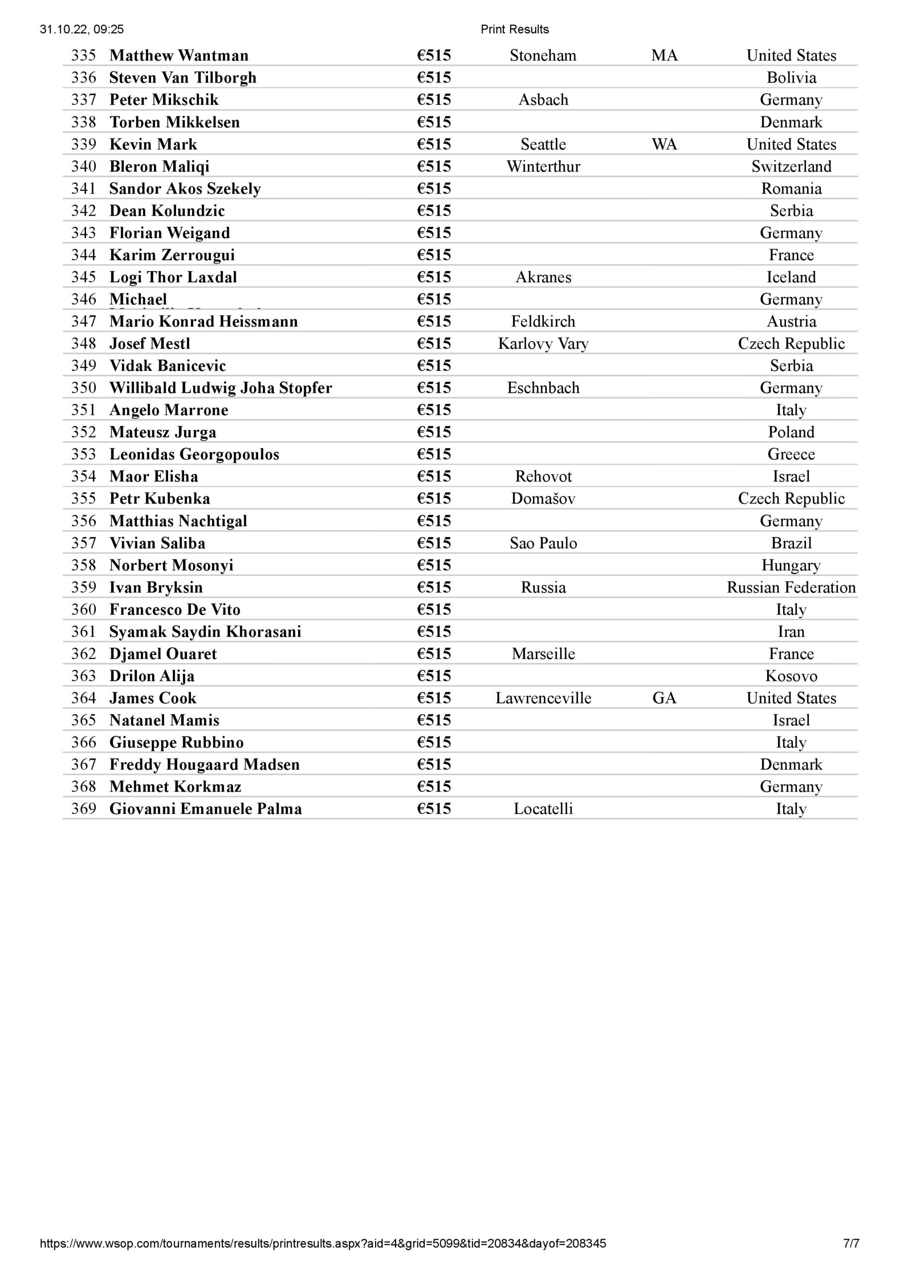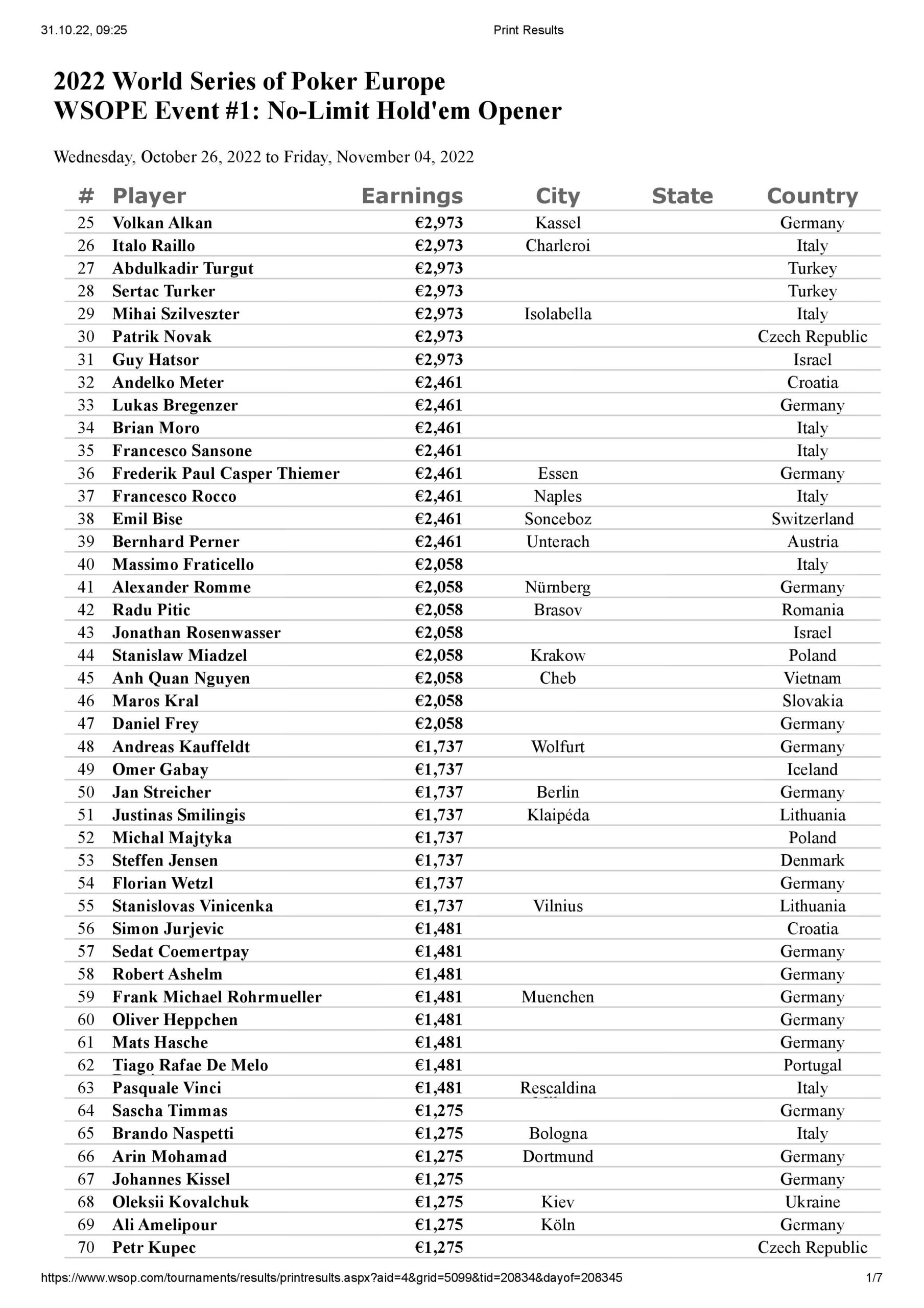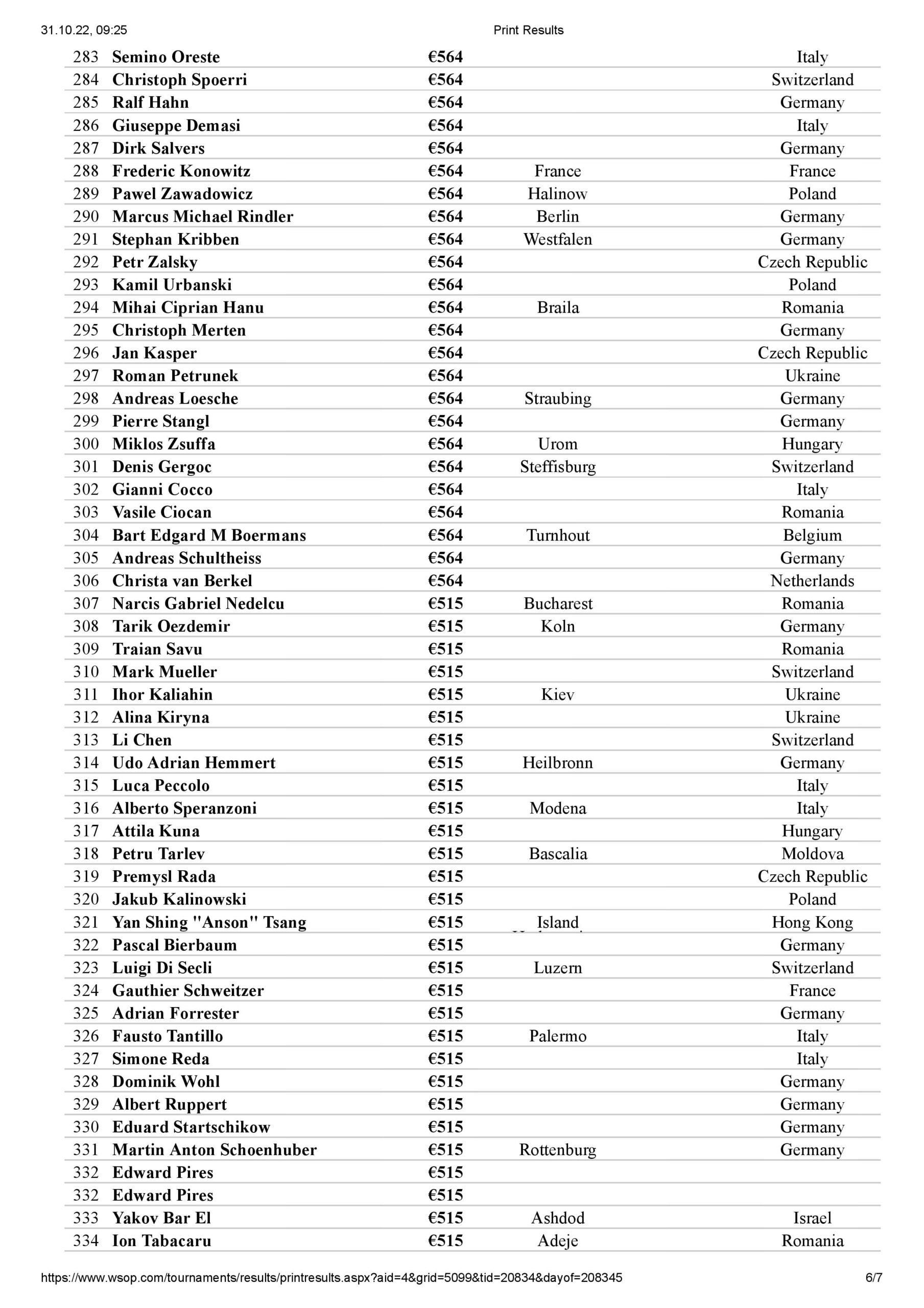 Payouts: (Plätze 1-6 + €10.350 WSOPE Ticket) –