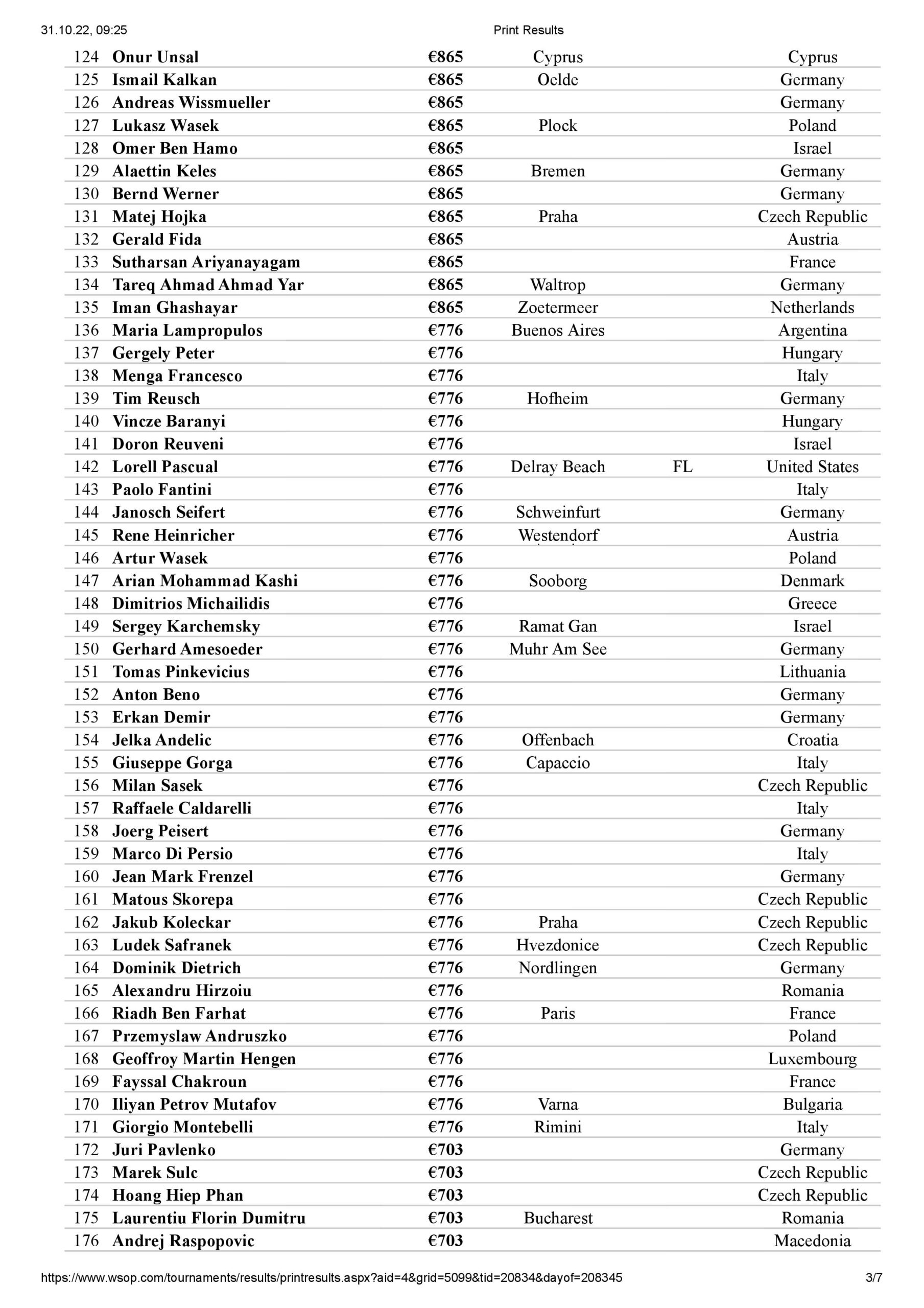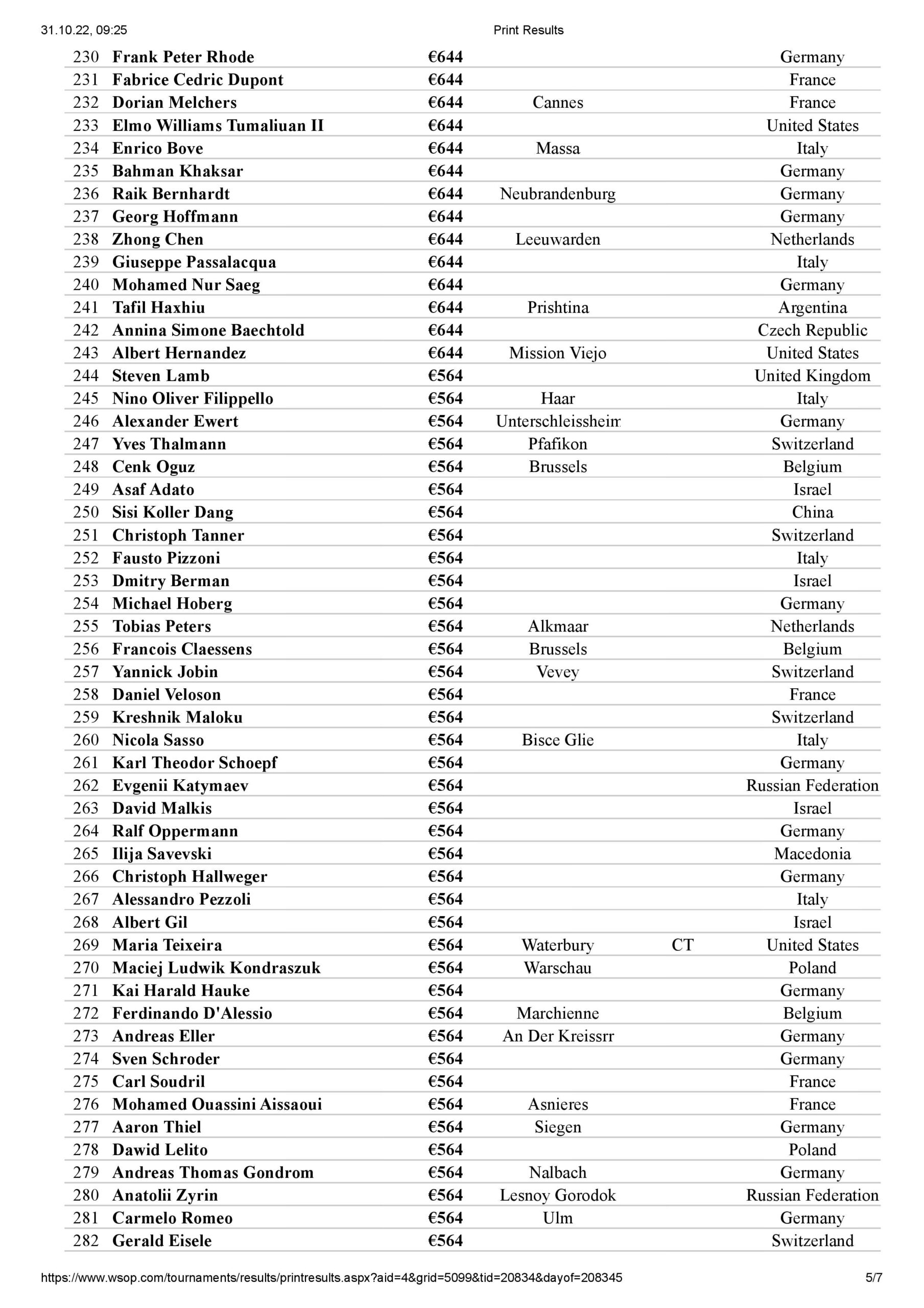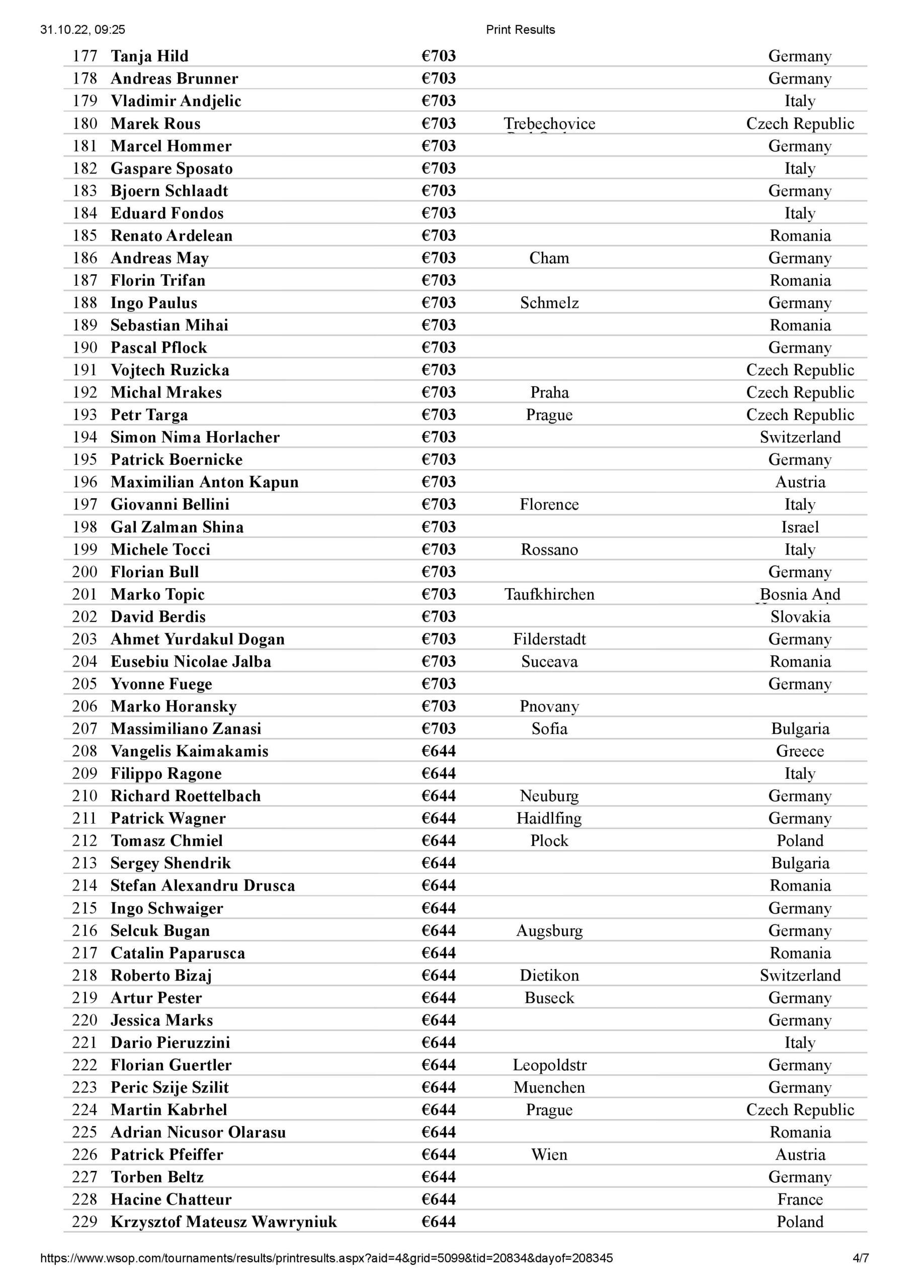 Payouts: (Plätze 1-6 + €10.350 WSOPE Ticket) –