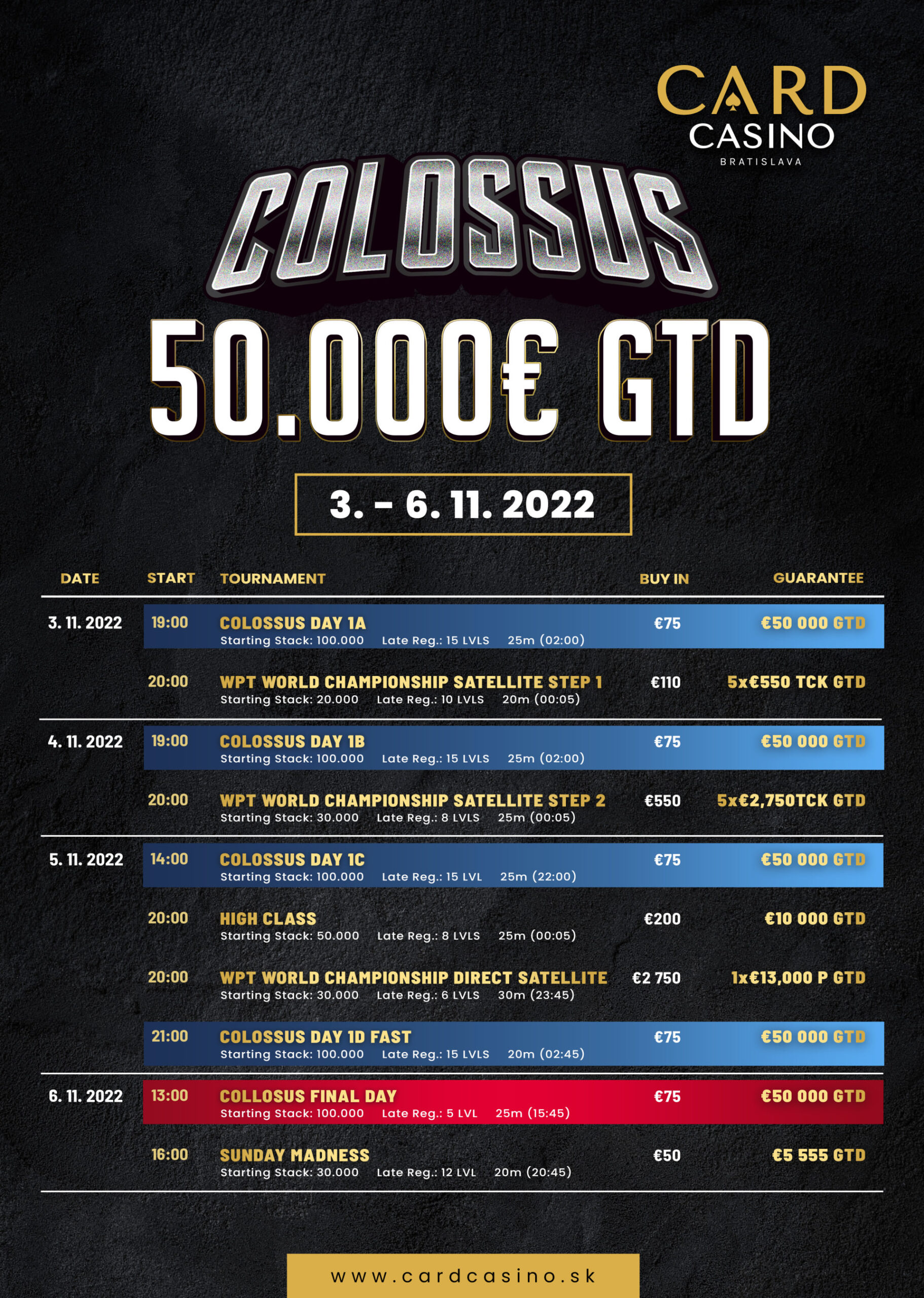 Die kommende Pokerwoche im Card Casino Bratislava steht ganz im Zeichen des No-Limit Hold’em Colossus.