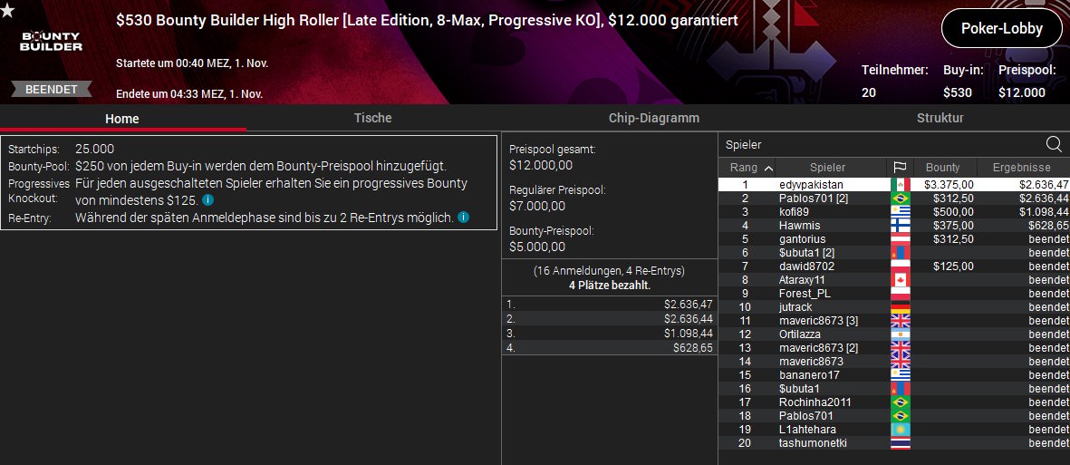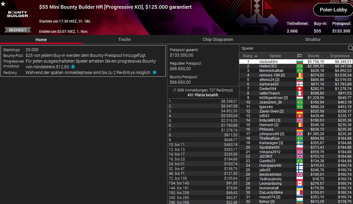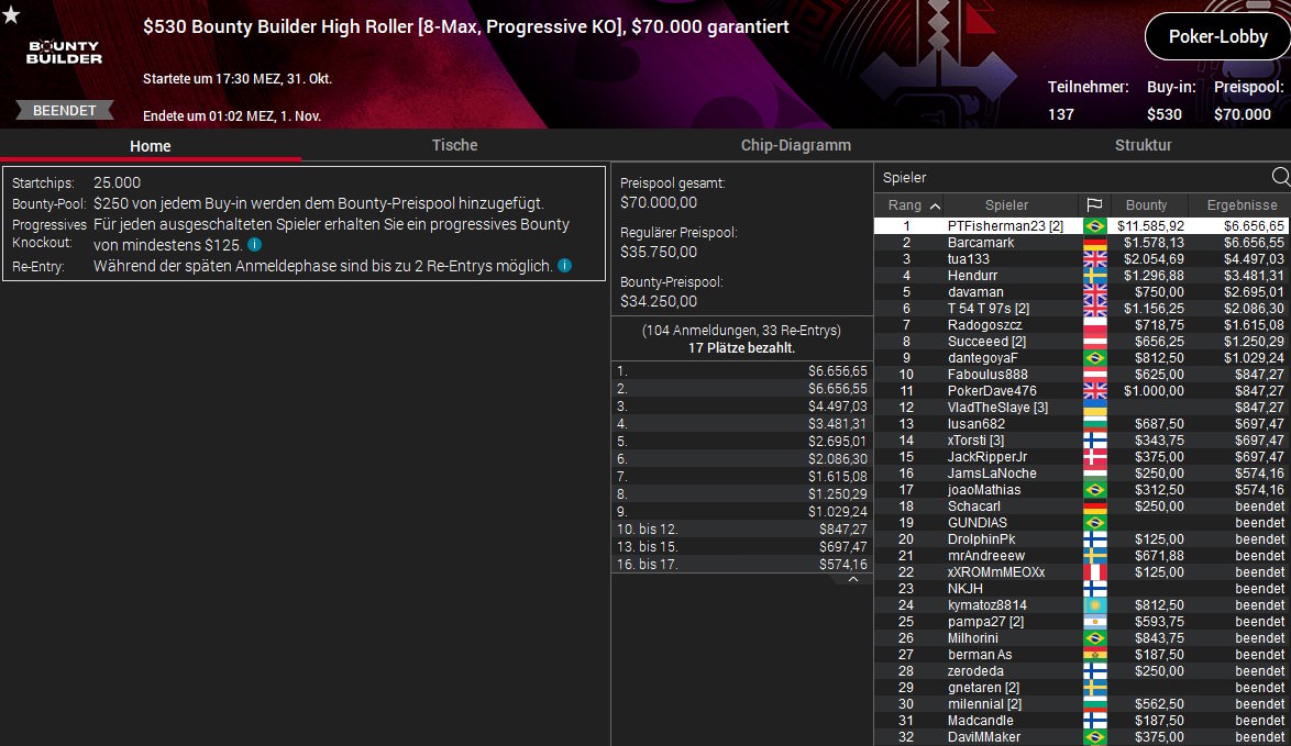 Einen starken Auftritt hatte dann auch noch Barcamark aus Deutschland beim $530 Bounty Builder High Roller. Sein zweiter Platz hinter Andre PTFisherman Marques ($6.656/$11.585) spülte ihm $6.656 plus $1.578 in die Bankroll.