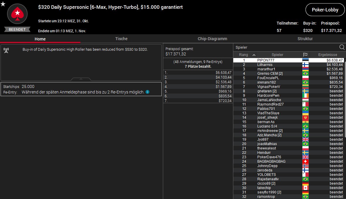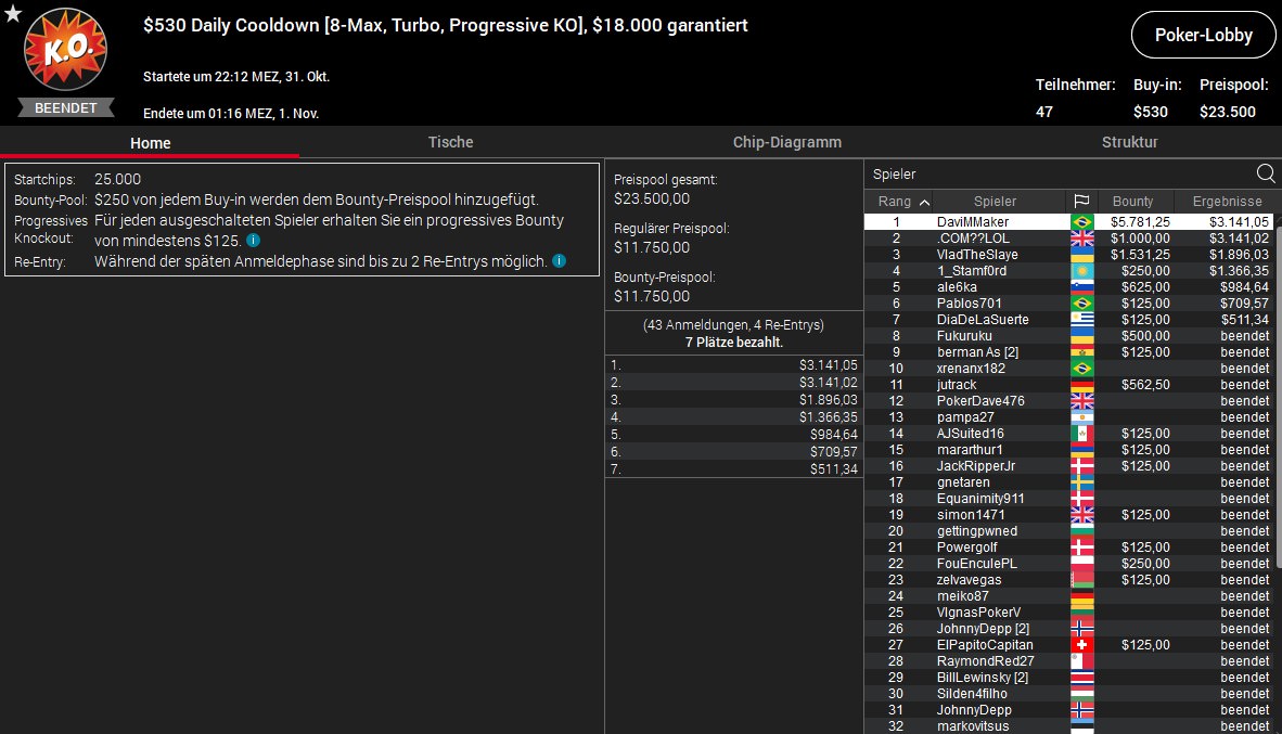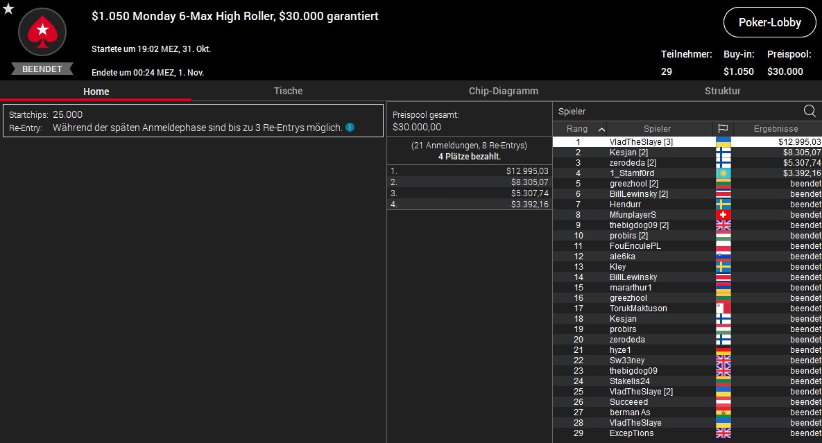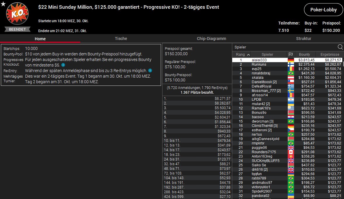 Auch beim $22 Mini Sunday Million mit 7.510 Entries (5.720/1.790) und einem $150.200 Preispool gelang einem Spieler aus Deutschland der große Wurf. Für Platz räumte aiaiai333 nicht nur $8.271 Prämie ab, zusätzlich hatte er auch $3.813 an Bounties eingesammelt. Gelohnt hat sich die Teilnahme auch für skalala aus Österreich, Platz fünf brachte ihm $2.6504 plus $1.160.