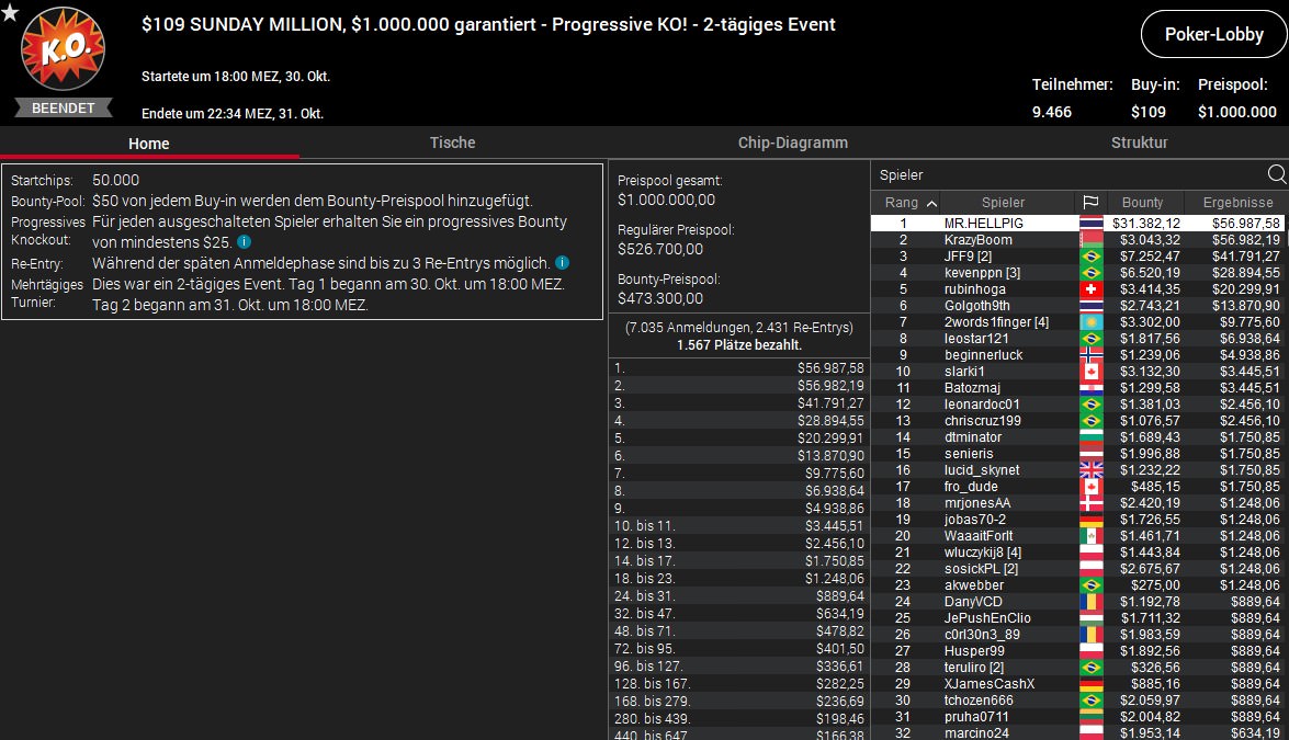 Beim traditionell größten wöchentlichen Turnier auf PokerStars, dem $109 Sunday Million PKO, wurde bei 9.466 die garantierte Million ausgespielt und mit rubinhoga schaffte ein Schweizer den Sprung an den Final Table. Am Ende belegte er den guten fünften Platz für $20.299 Preisgeld plus $3.414 an Bounties. Den Sieg holte MR.HELLPIG aus Thailand für $56.987 plus $31.382.
