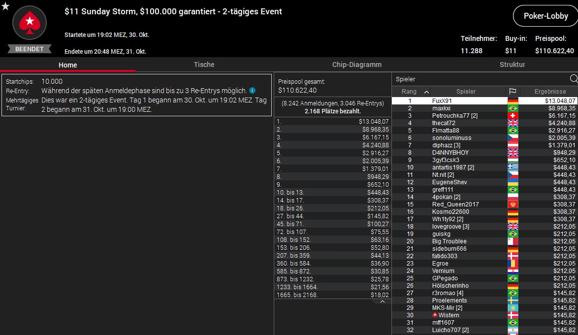 Beginnen wir mit dem $11 Sunday Strom, über das bei 11.288 Teilnehmern ein Preispool in Höhe von $110.622 ausgespielt wurde. Die Entscheidung fiel wie gewohnt am Montag und am triumphiert FuxX91, der sein $11-Investment somit in sensationelle $13.048 verwandelte. Zudem kassierte Petrouchka77 aus der Schweiz als Dritter starke $6.167 und diphazz aus Österreich bekam als Siebter $1.279 ausbezahlt.