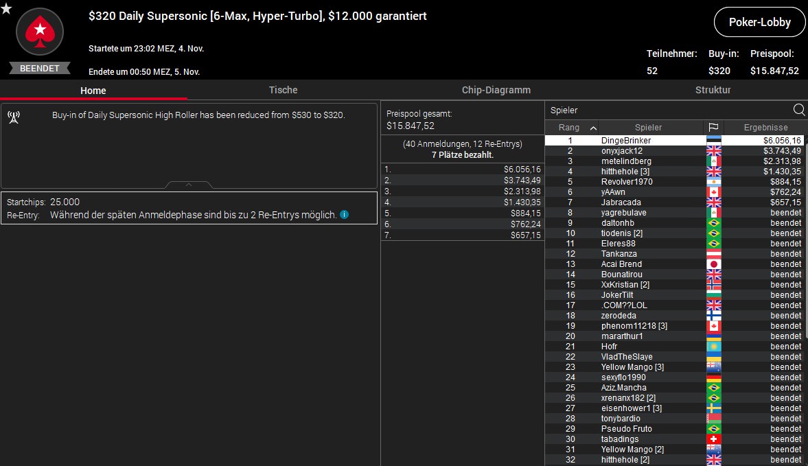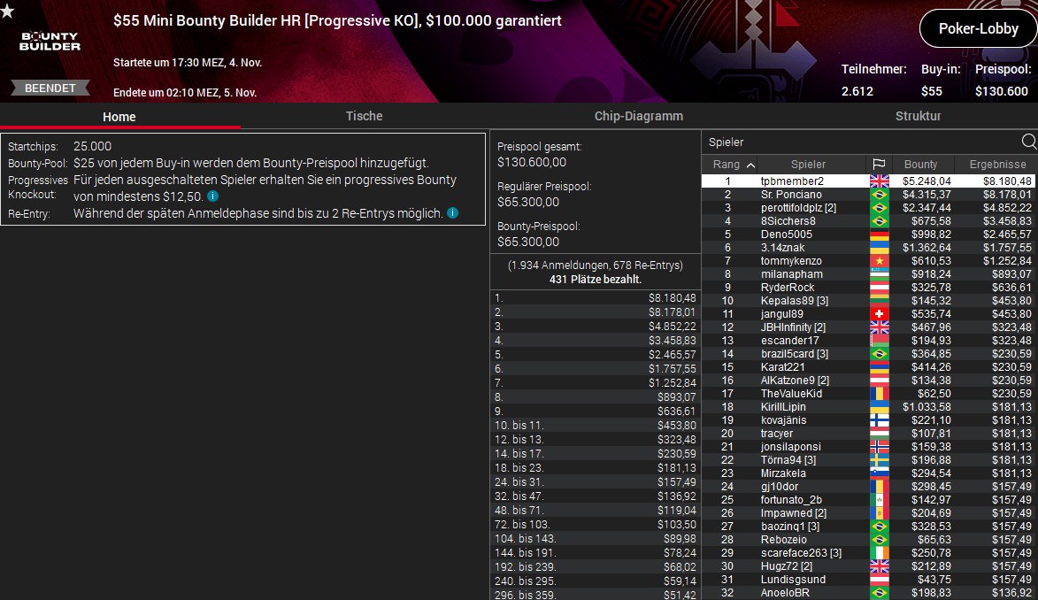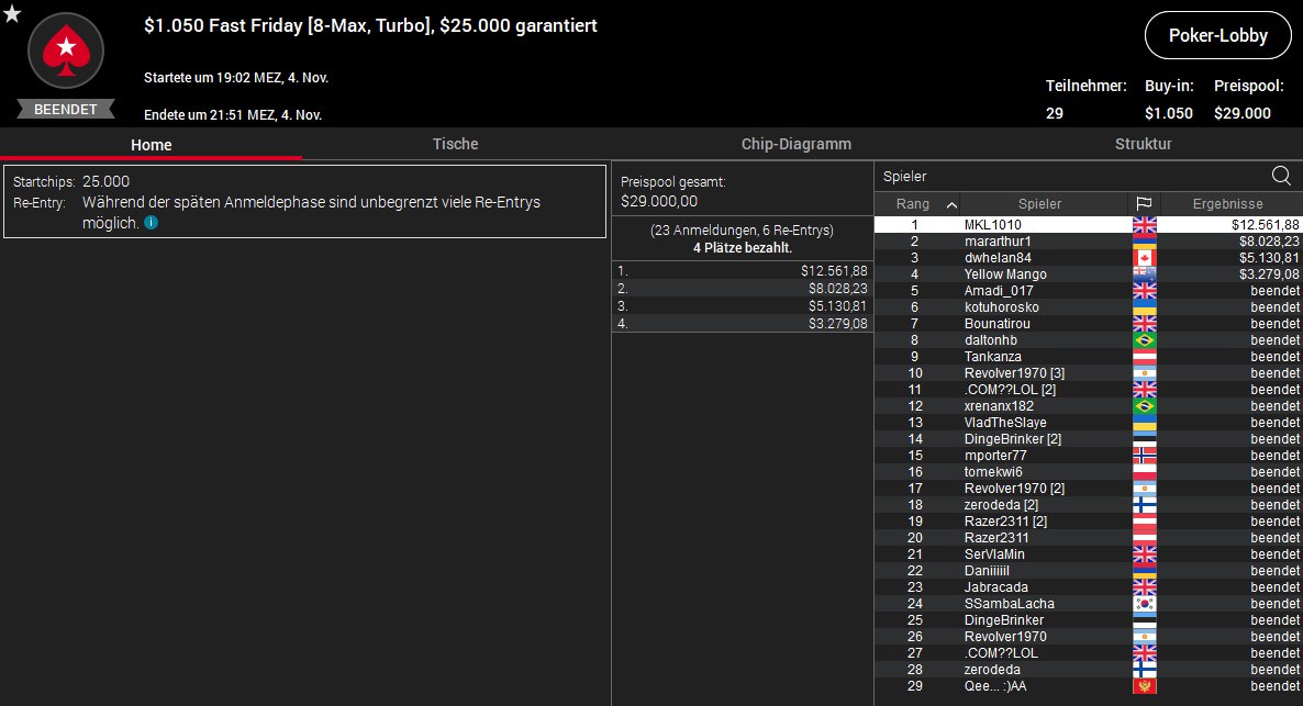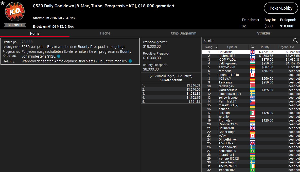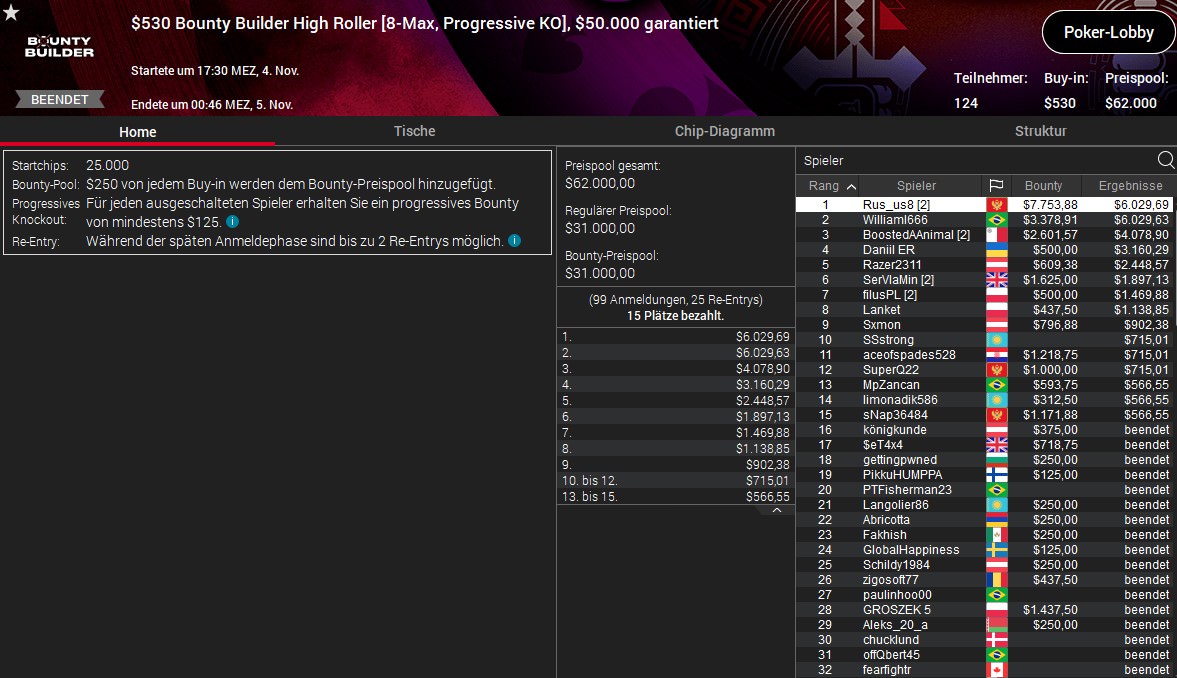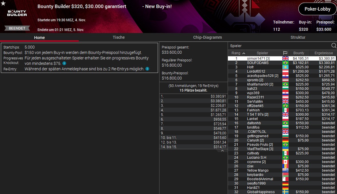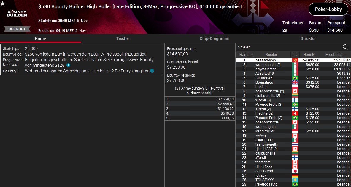 Weitere gut Platzierungen verbuchten Lordof0512 (4./$1.671/$1.200) beim $320 Bounty Builder, sexyflo1990 (5./$721/$687) beim $530 Daily Cooldown und Deno5005 (5./$2.465/$998) beim $55 Mini Bounty Builder HR.