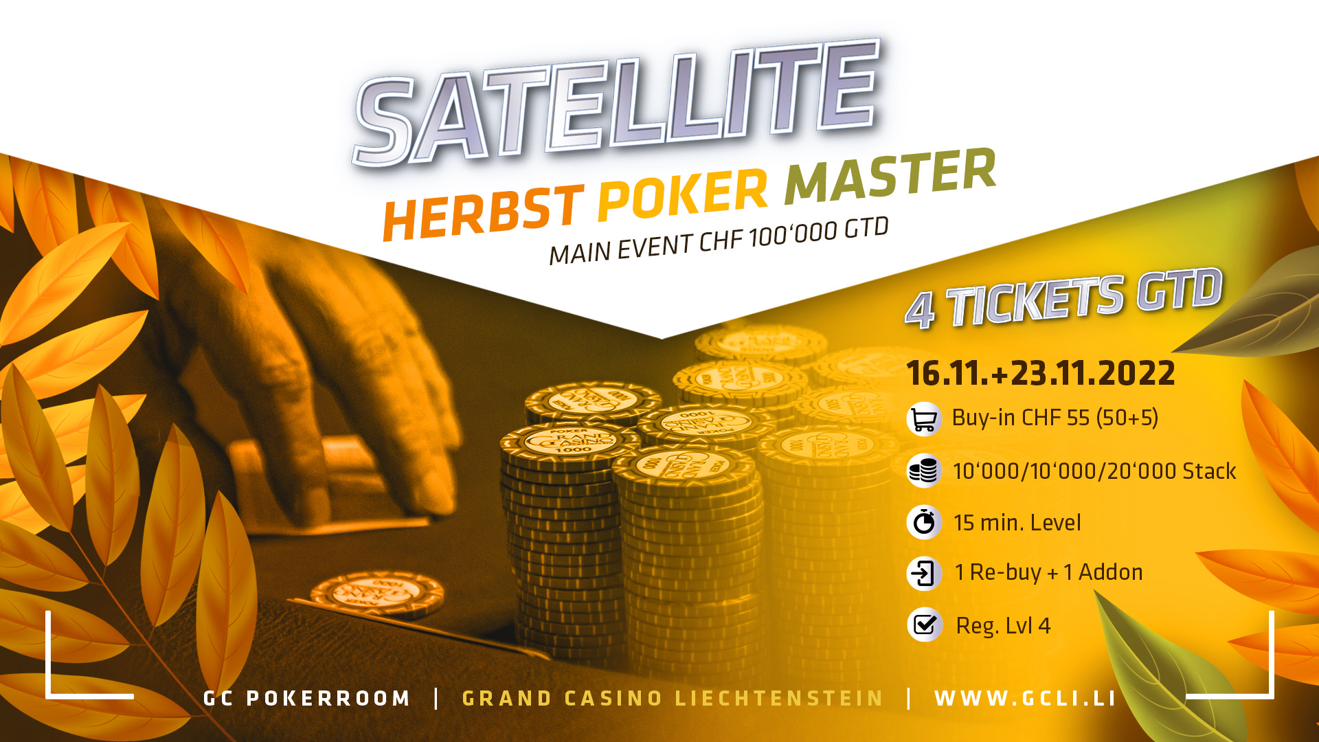 Am Mittwoch findet das zweite und letzte CHF 50+5 Satellite für die Herbst Poker Masters (HPM) statt. Hier sind vier Tickets garantiert. Man startet mit 10.000 in Chips und ein Rebuy (CHF 50 = 10.000 Chips) und ein Add-On (CHF 50 = 20.000 Chips) sind möglich. Jeder Level dauert beim Satellite 15 Minuten. Die Late-Registration ist für sechs Levels geöffnet.