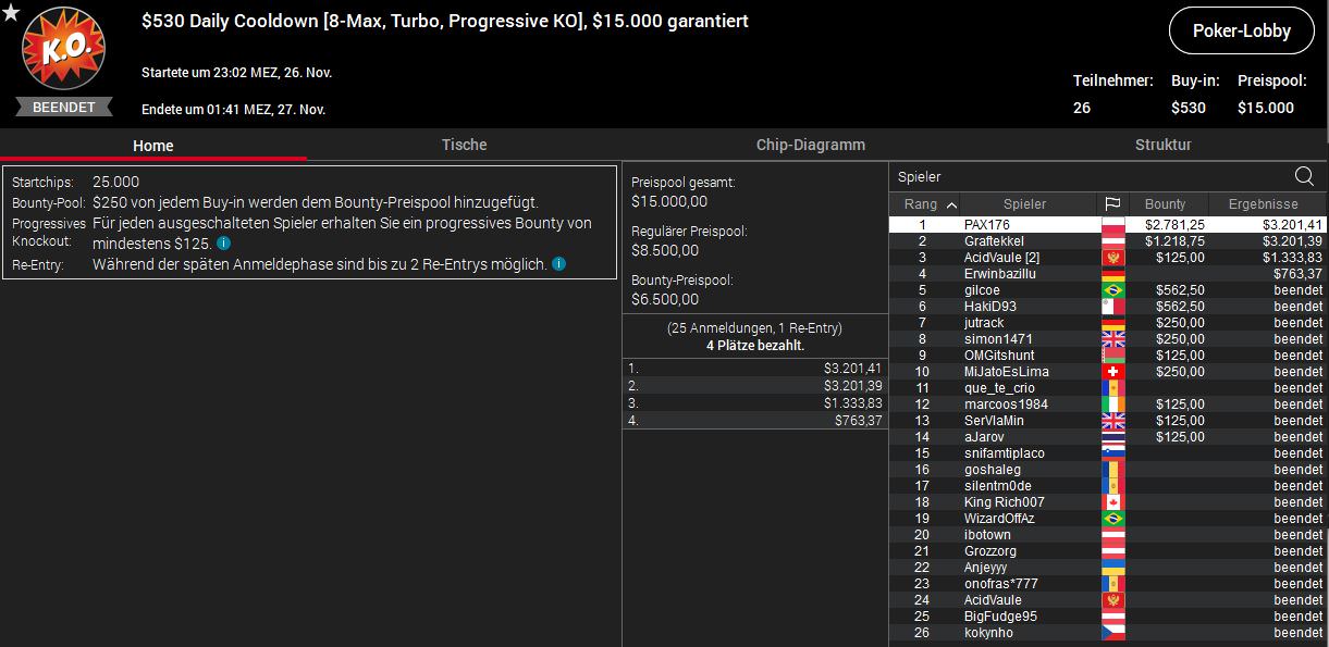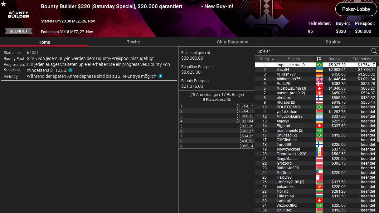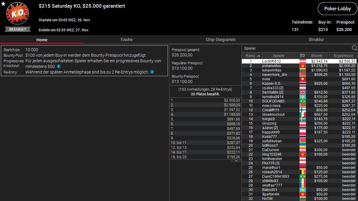 Der Österreicher Lordof0512 hatte am Freitag beim Bounty Builder High Roller Platz zwei belegt, gestern feierte er dann den Sieg beim $215 Saturday KO. Auch hier wurden 131 Entries registriert (Preispool $26.200) und LOrdof0512 bekam $2.500 plus $2.543 ausbezahlt.
