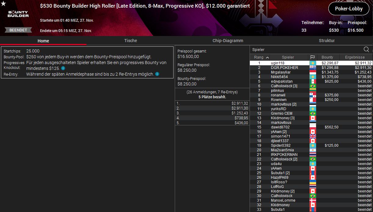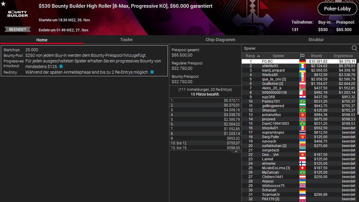 Am lukrativsten war die Angelegenheit für FG BC aus Deutschland. Er setzte sich beim $530 Bounty Builder High Roller in einem Feld mit 131 Entries (Preispool $65.500) durch und kassierte neben $6.370 Prämie zusätzlich $10.381 an Bounties.