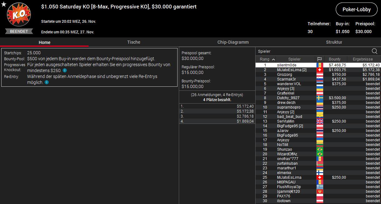 Knapp am Sieg vorbeigeschrammt ist MiJatoEsLIma beim $1.050 Saturday KO. Heads-up unterlag der Schweizer Pavel silentm0de Plesuv ($5.172/$7.468) und kassierte $5.172 plus $1.093. Platz drei ging an Grozzorg ($2.786/$750) aus Österreich.