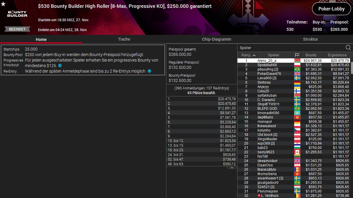 Fangen wir aber mit dem $109 Sunday Million PKO an. Auch in dieser Woche wurde die garantierte $1 Million bei 9.590 Entries (7.176/2.414) knapp verfehlt, sodass ein kleines Overlay im Spiel ist. Den ersten Spieltag haben 98 Teilnehmer überstanden, gleich fünf DACH-Spieler sind weit vorne platziert. Am besten sieht es bei ddonkat aus Österreich als Zweiter aus, in Schlagdistanz lauern die Deutschen langilangsen, 3×3.1.tor.84 und newkorea sowie Pokerlino2021 aus der Schweiz. Auf die beiden Erstplatzierten warten jeweils $56.300 Prämie, dazu kommen natürlich noch lukrative Bounties.