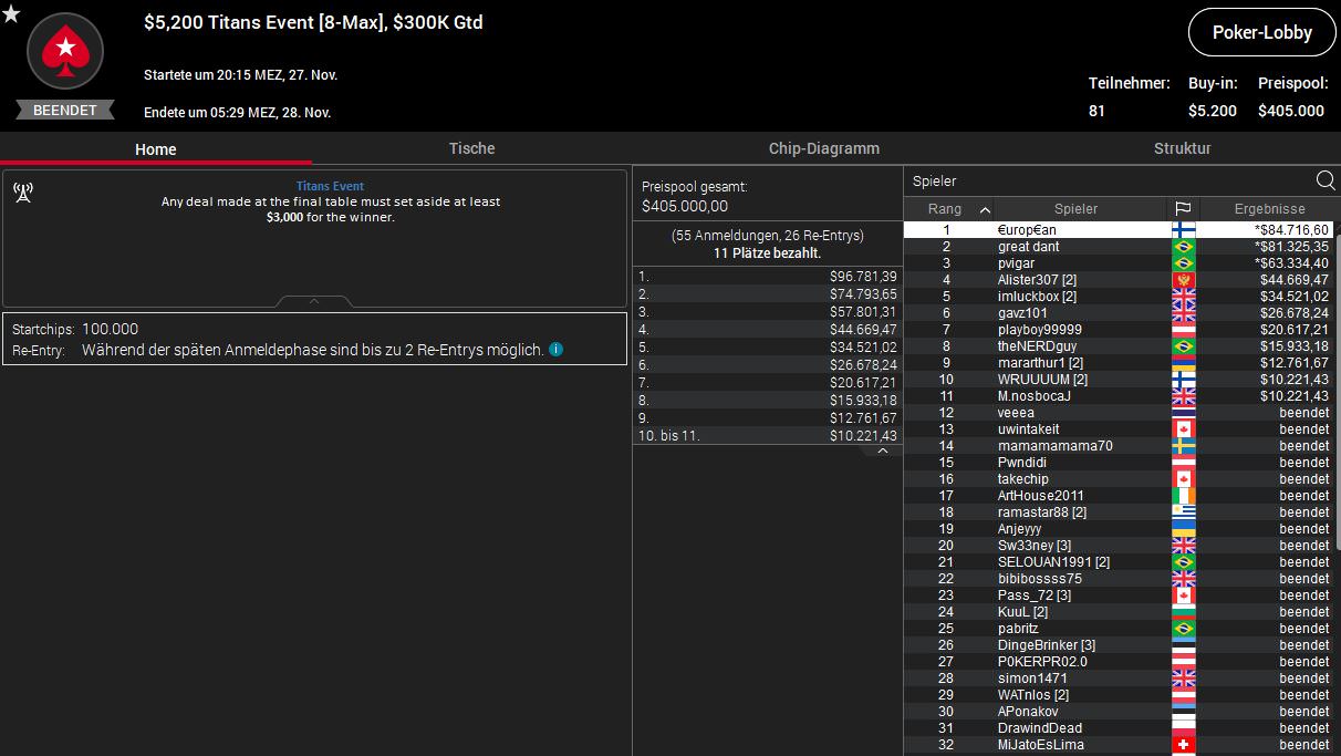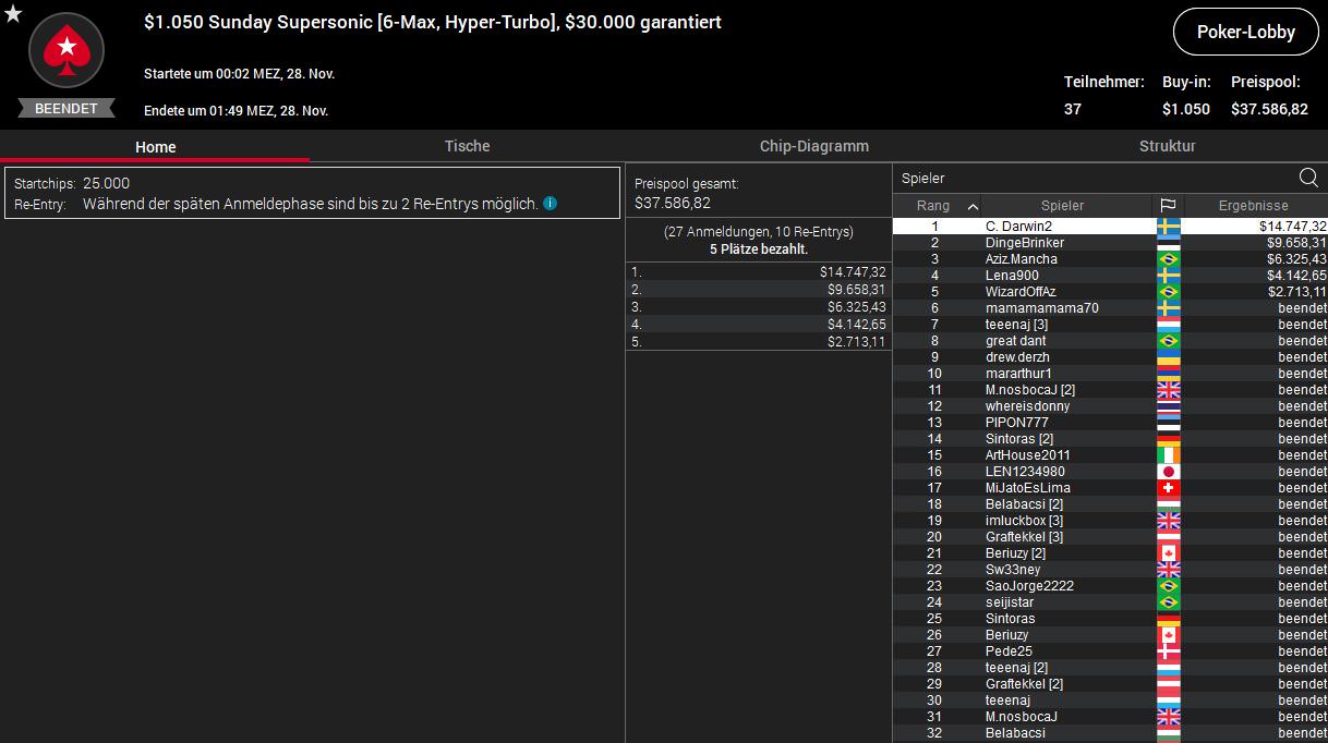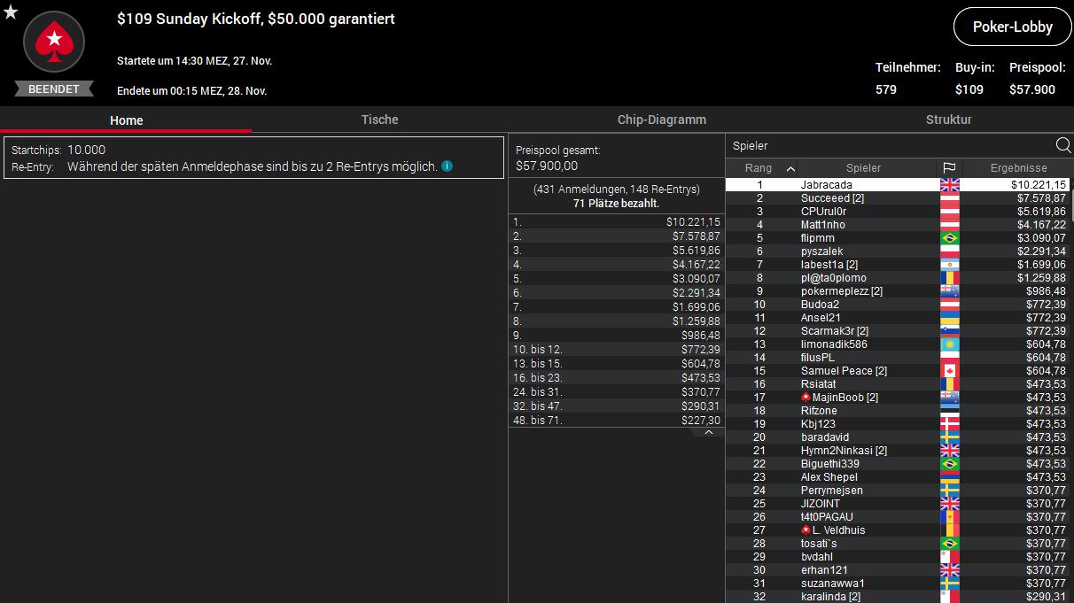 Beim $109 Sunday Kickoff verpassten gleich drei Spieler den Sieg. Hinter dem Briten Jabracada ($10.221) belegten Jakob Succeeed Miegel ($7.578), CPUrur ($5.619) und Matt1nho ($4.167) die Plätze zwei bis vier.
