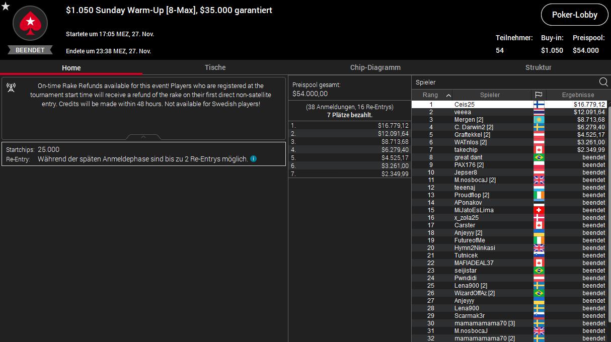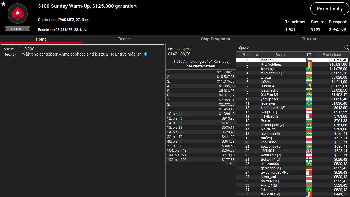 Beim $109 Sunday Warm-Up musste sich Twitch-Streamer und PokerStars Pro Lex Veldhuis ($15.537) Heads-up jobekr ($21.798) aus Tschechien geschlagen geben. Der Österreicher tekelson221 ($7.895) belegt hier Platz vier.
