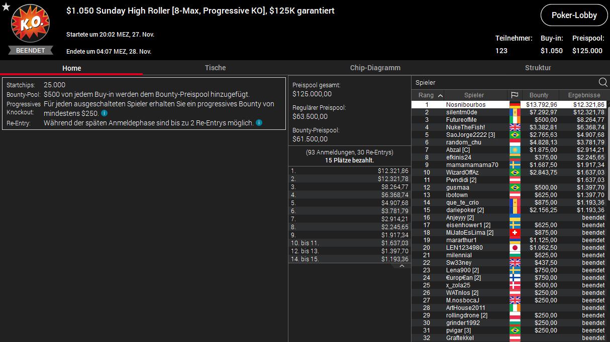 Nosnibourbos setzte sich beim $1.050 Sunday High Roller in einem Feld mit 123 Entries durch, verwies Heads-up Pavel silentm0de Plesuv auf Platz zwei und kassierte $12.321 Prämie plus $13.792 an Bounties.