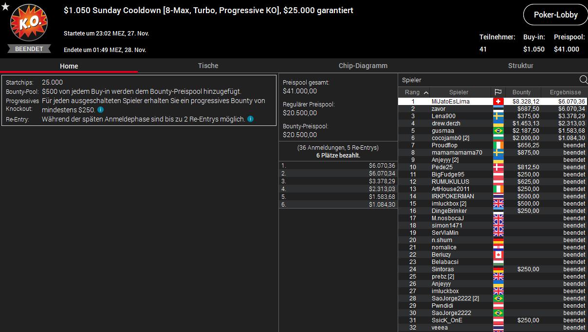 Der Schweizer MiJatoEsLIma hatte am Samstag den Sieg beim Saturday KO als Zweiter knapp verpasst, dafür gewann er diesmal das $1.050 Sunday Cooldown für $6.070 plus $8.328.