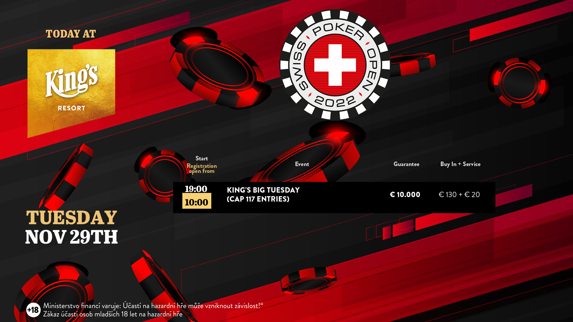 Heute steht im King’s als Vorbote der Swiss Poker Open das King’s Special Big Tuesday statt. Das Startgeld beträgt €130+20, €10.000 Preisgeld werden garantiert, los geht es um 19 Uhr.