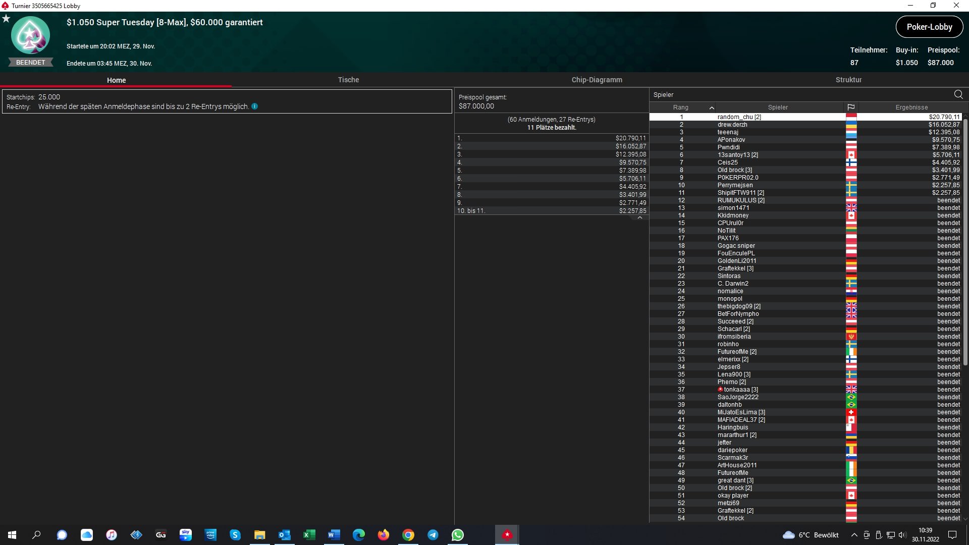 Am Dienstag war das $1.050 Super Tuesday Event mit 87 Entries und $87.000 Preispool das größte Turnier bei den High Rollern. Hier schnappte sich Steven „random_chu“ Chew (POL) den Titel und $20.790.