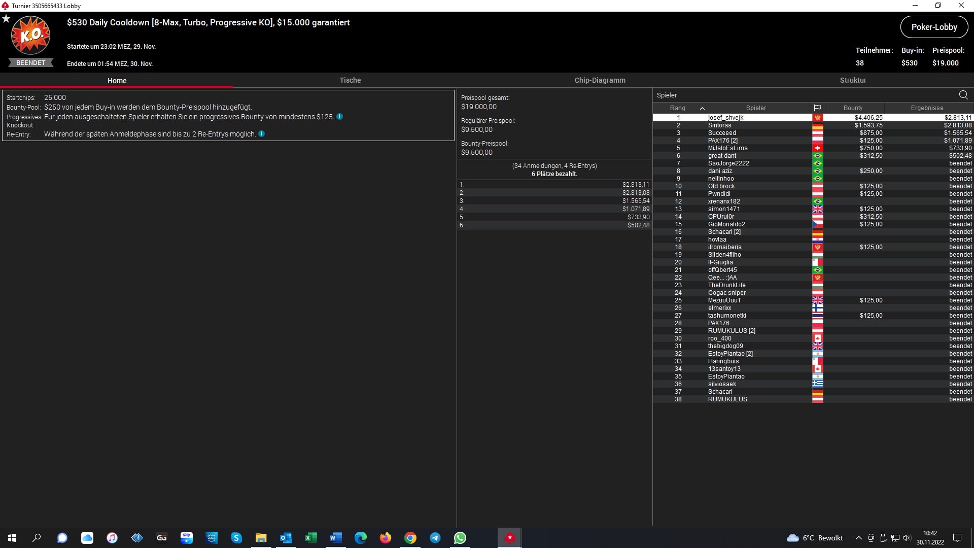 Jakob wurde dann auch noch Achter für $642 + $506 Bounties beim $320 Bounty Builder. Hier ging der Sieg an „ArtHouse2011“ (IRL) für $3.740 + $5.198 Bounties.