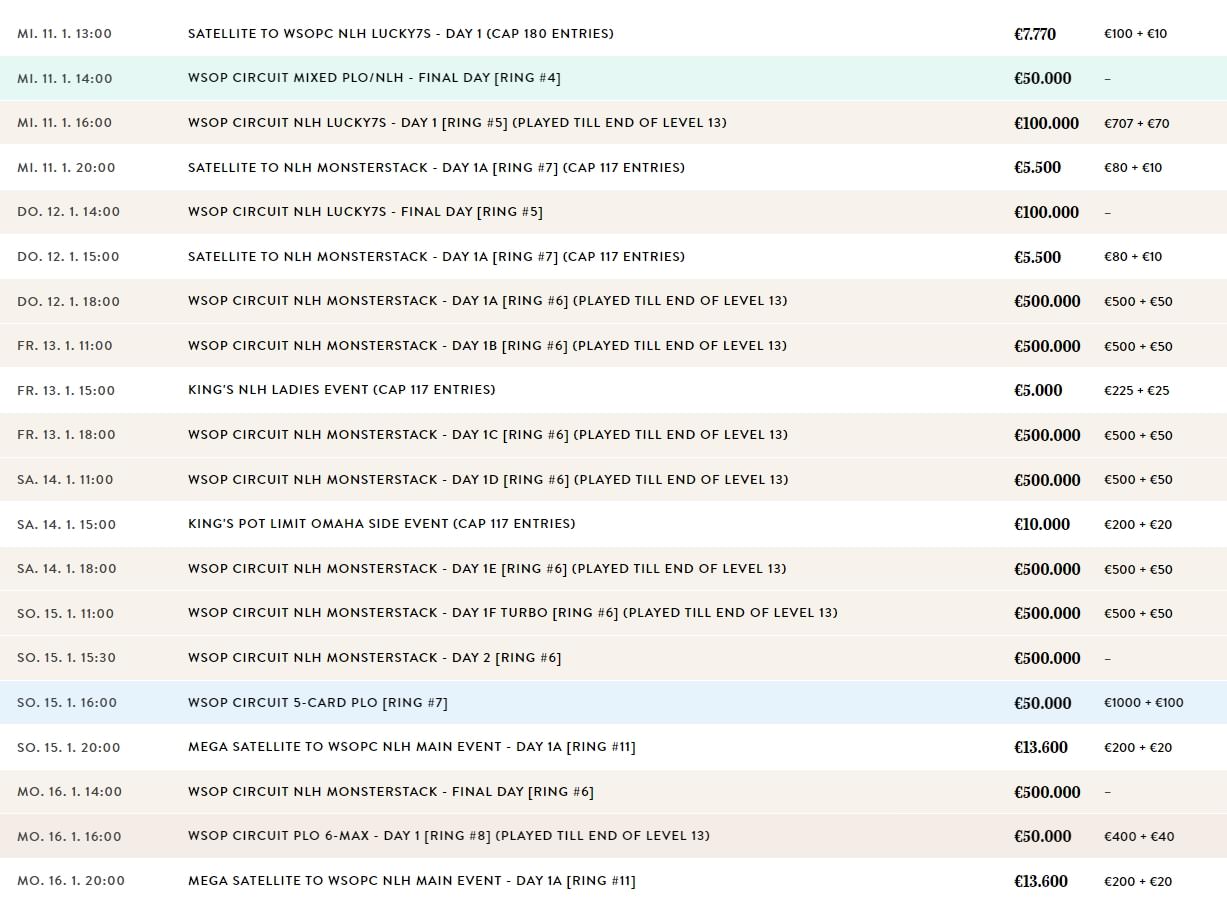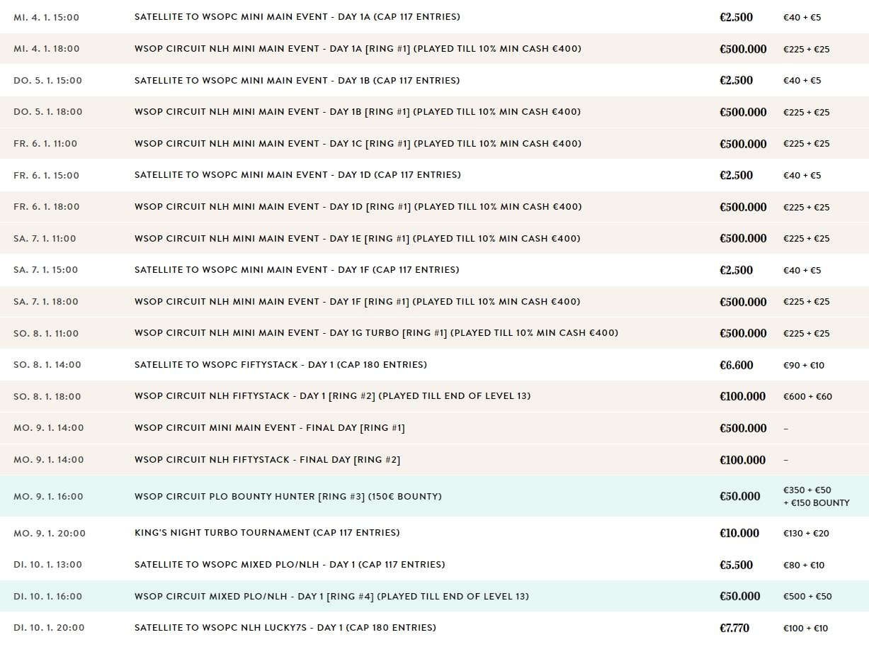 Los geht das Festival mit dem günstigsten Ring-Event. Vom 04.- 09. Januar wird das €225+€25 WSOP Circuit Mini Main Event #1 gespielt, bei dem es mindestens um €500.000 gehen wird.