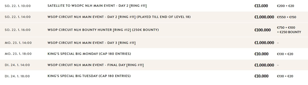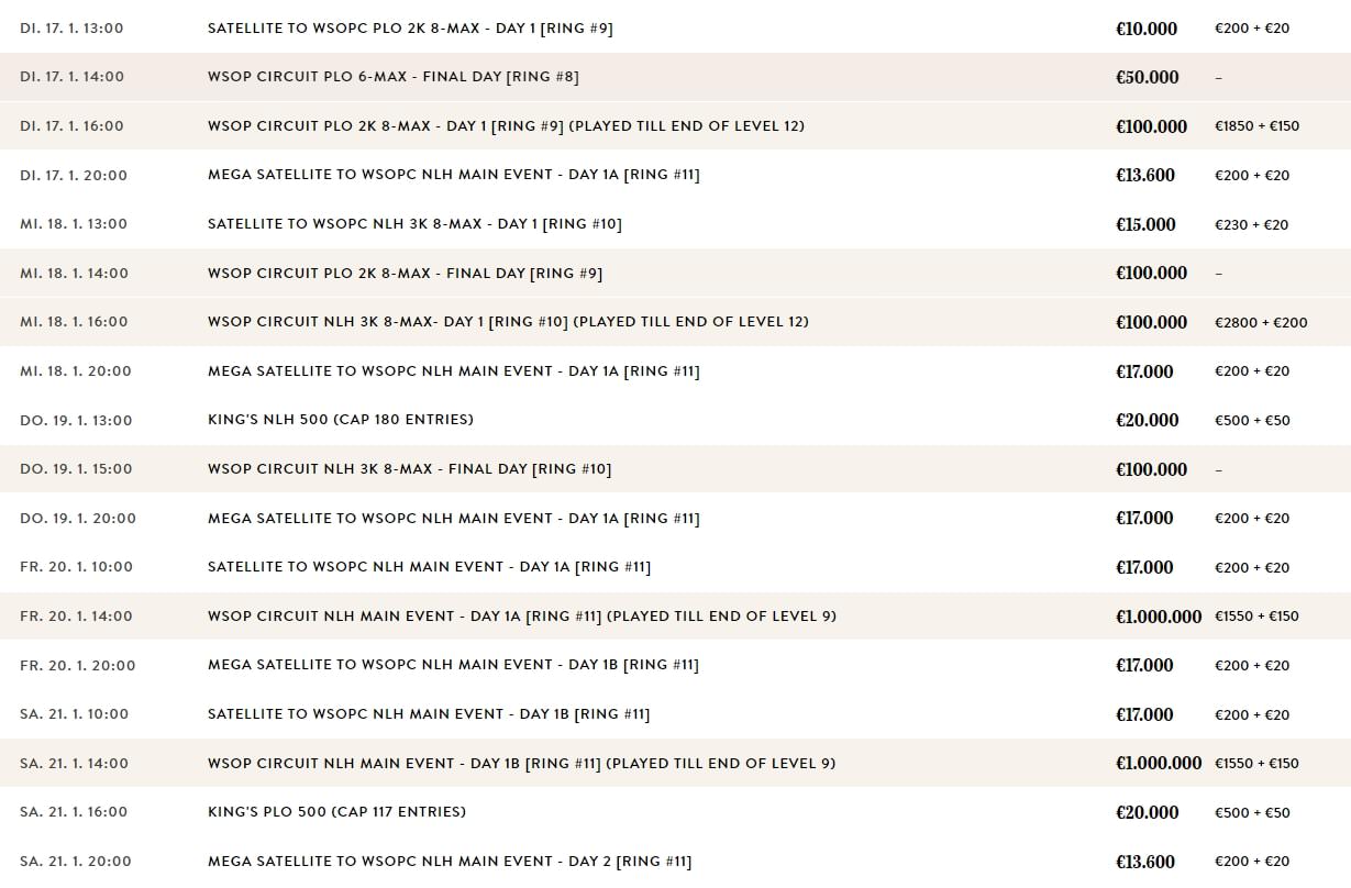 Die Buy-Ins bei den Ring-Events reichen von €250 bis hin zu €3.000. Der Höhepunkt des Festivals ist wie immer der €1.550+€150 WSOP Circuit Main Event Ring #11 (vom 20.- 24. Januar), der neben dem Ring noch ein Preisgeld von €1.000.000 garantiert.