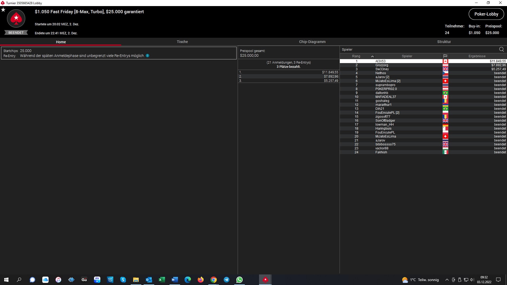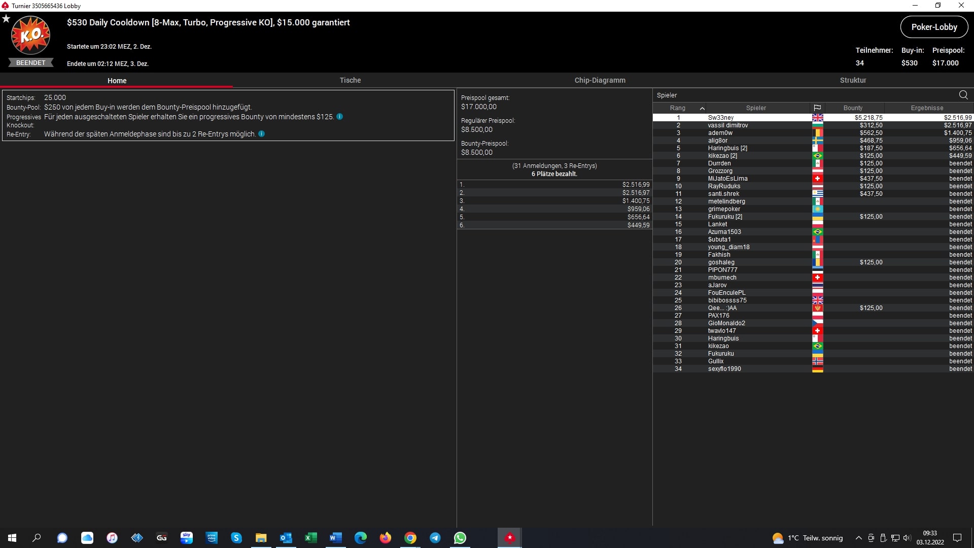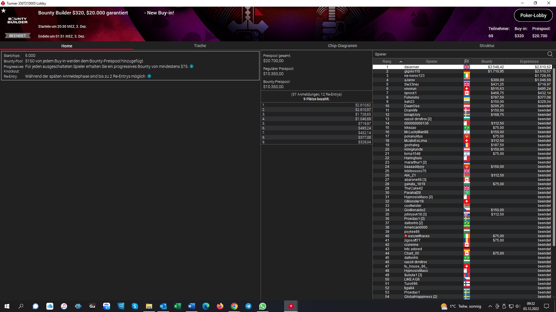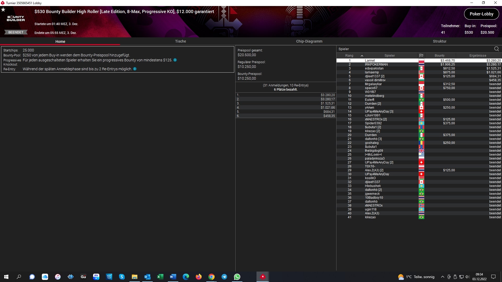 Ebenfalls Platz 2 holte sich der Deutsche „Gigolo110“ beim $320 Bounty Builder und wurde mit $2.610 + $1.710 Bounties entlohnt. Der Sieg und $2.610 + $3.548 Bounties gingen an den Briten David „davaman“ Lopez.
