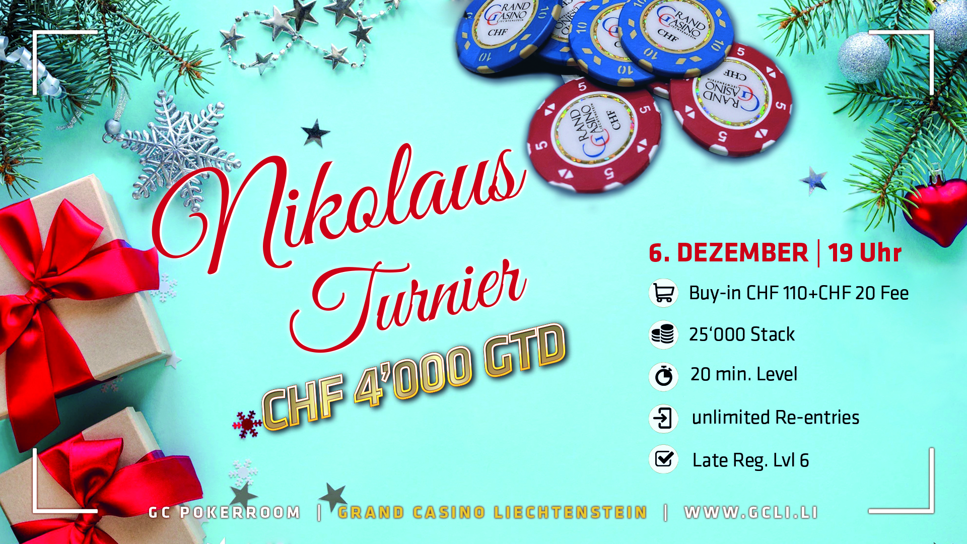 Los geht es am Freitagabend um 19 Uhr mit dem CHF 100+40+15 Progressive Bounty, bei dem CHF 4.000 garantiert werden. Jeder Spieler erhält 30.000 Chips, die Level dauern zwanzig Minuten und man kann bis Level 6 unbegrenzt Re-Entrys tätigen.
